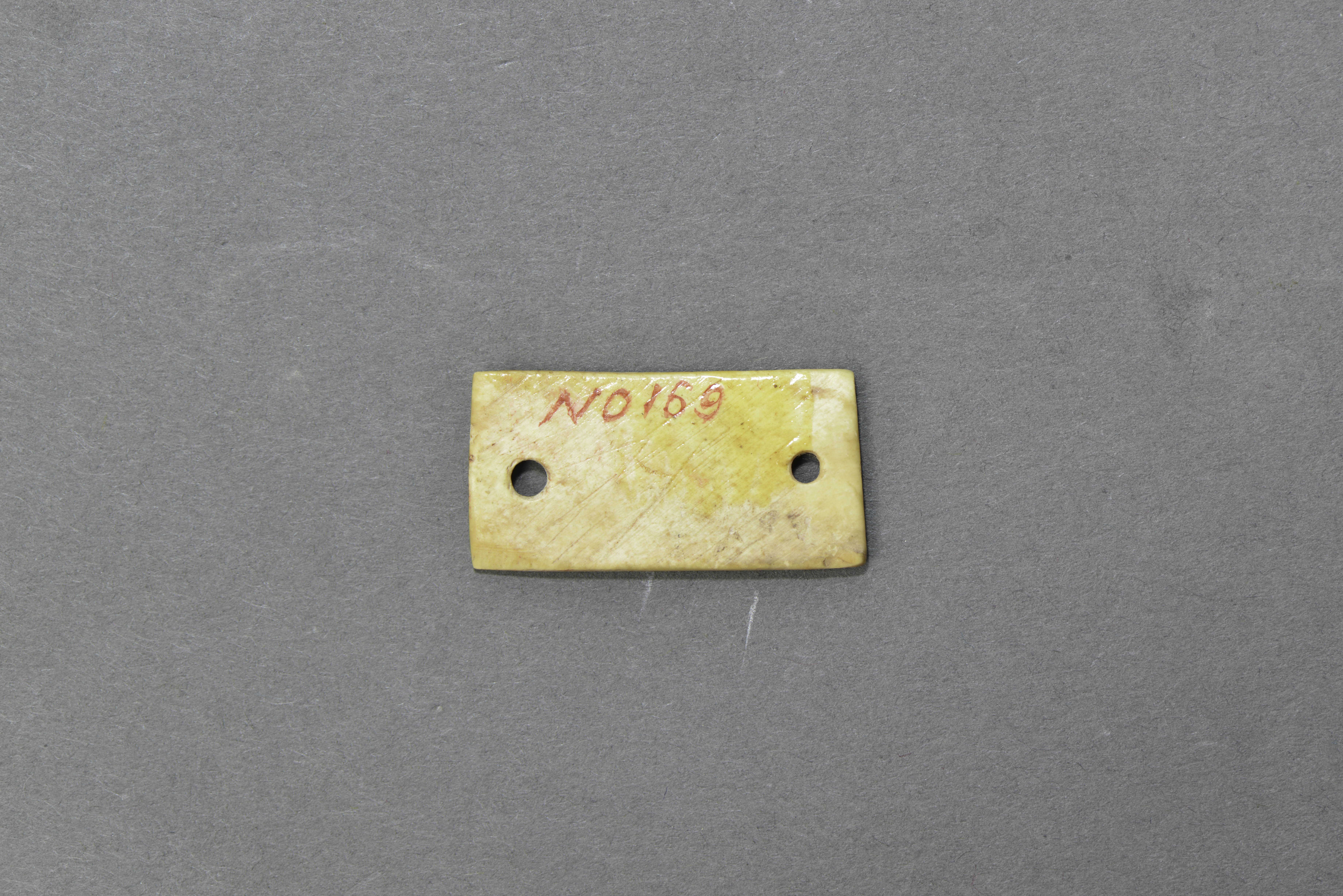 长方形,两端各有一圆穿。
