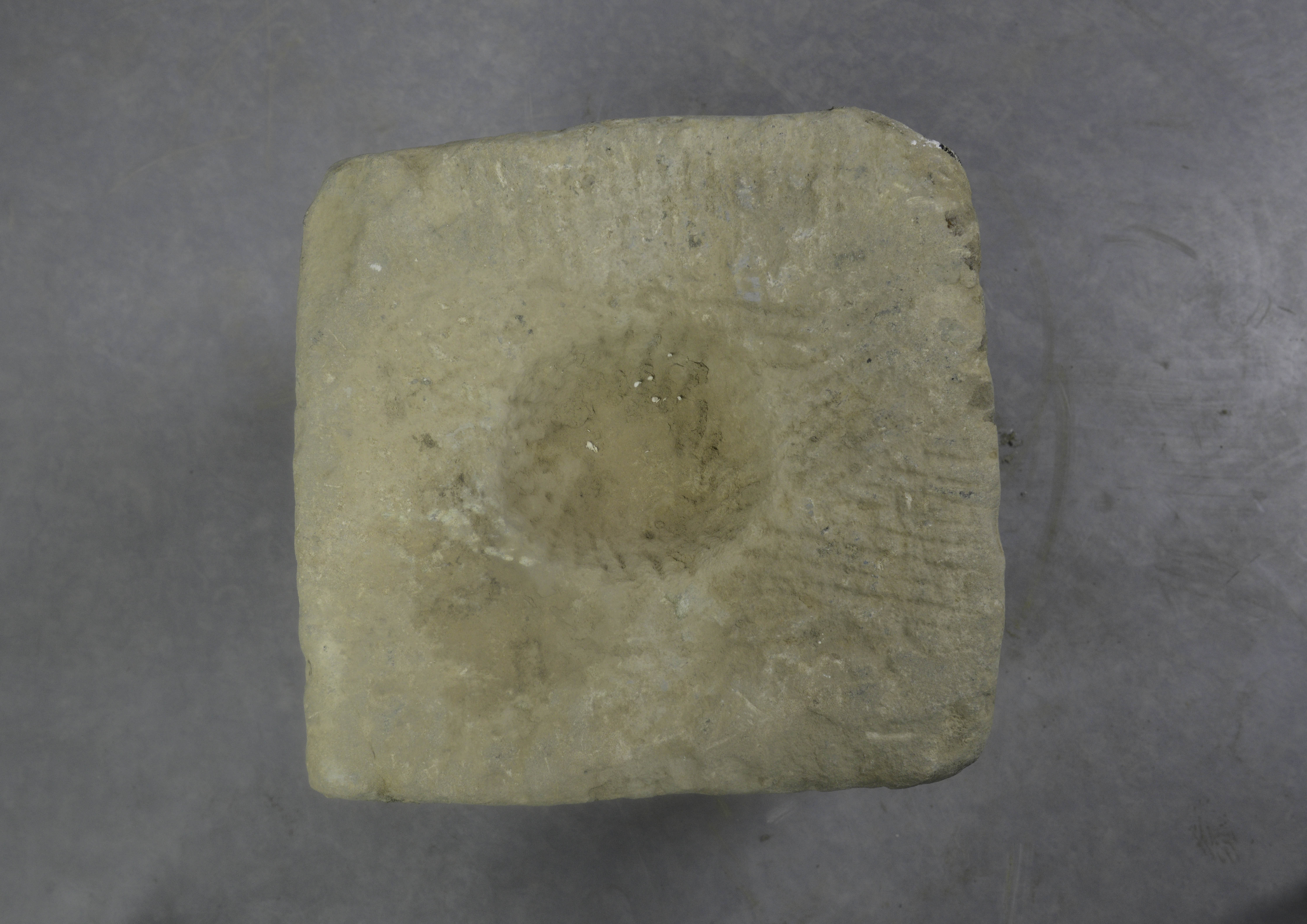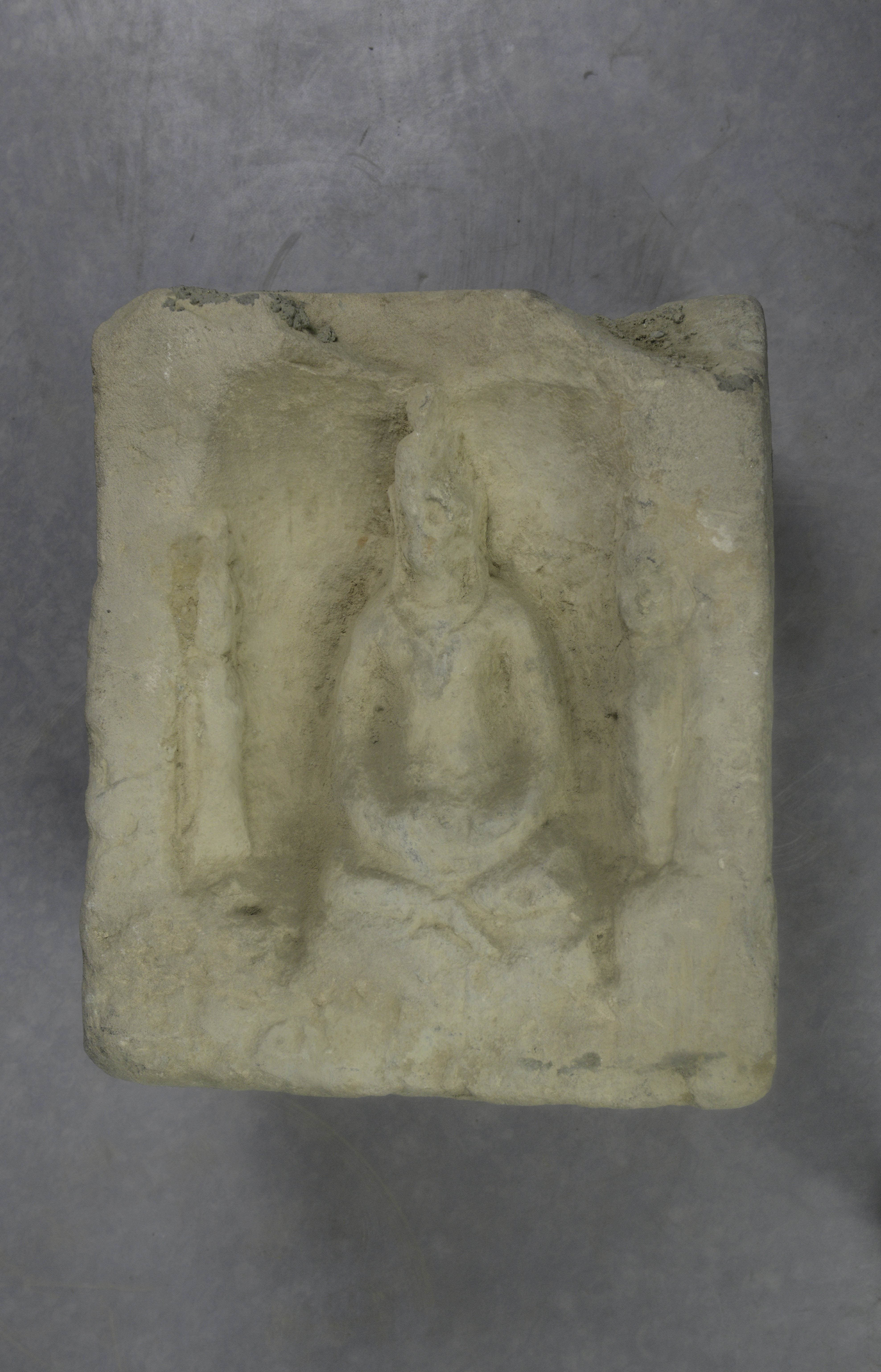 灰黄色细砂岩质。塔身作四面柱状,三壁开拱顶龛,一壁开方龛,内均雕一佛二菩萨造像,佛均结跏趺坐,施禅定印,风化严重,细部漫漶不清。