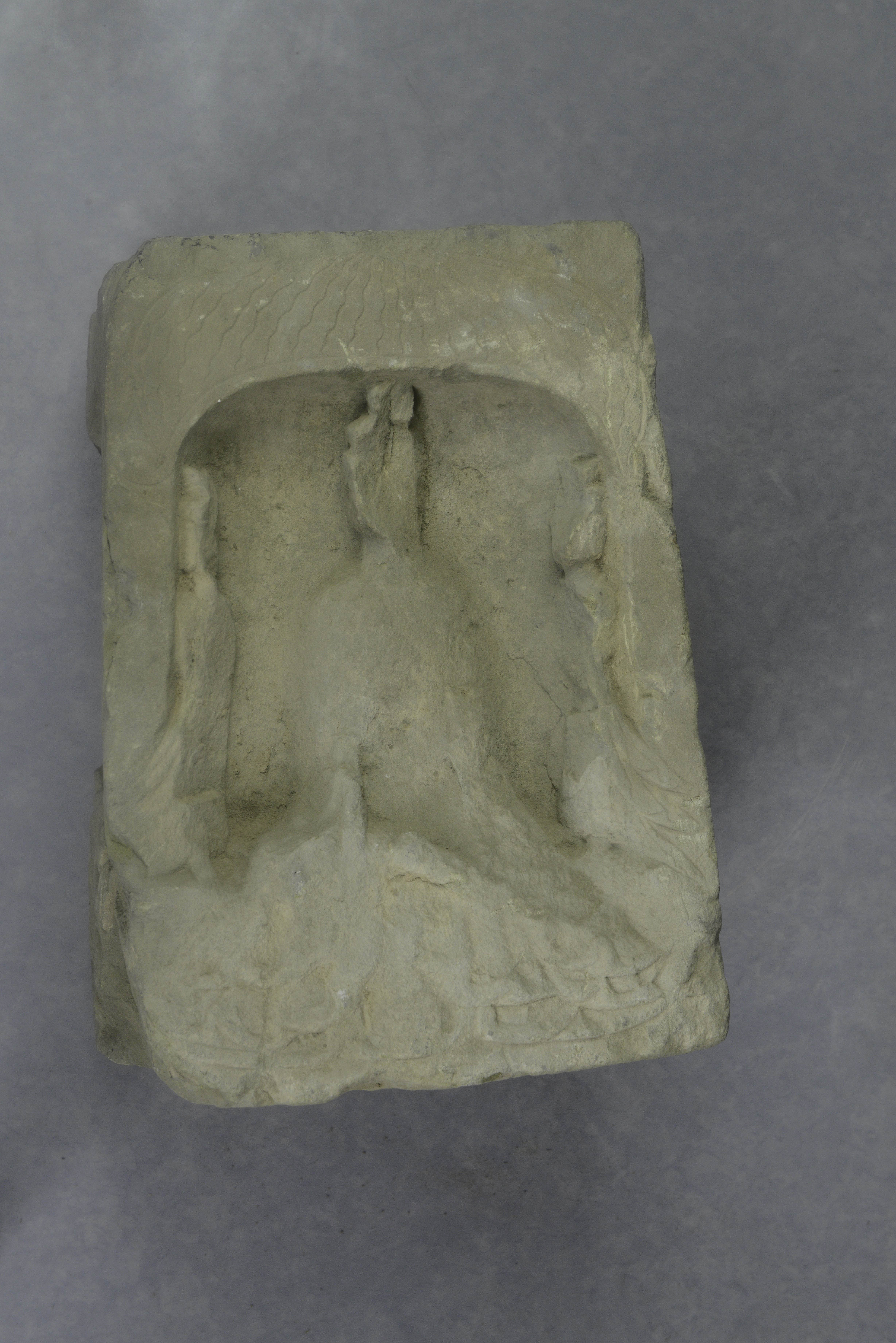 灰黄色砂质岩。塔身作上大下小四面柱状,四壁开拱顶龛,两龛内雕一佛二菩萨,佛均高肉髻,着通肩袈裟,结跏趺坐,一施禅定印;一模糊不清;一龛内仅存一主尊坐佛,着通肩袈裟,跣足交脚而坐,施禅定印;另一龛内似为佛传故于阿育王施土。龛楣阴刻火焰纹。