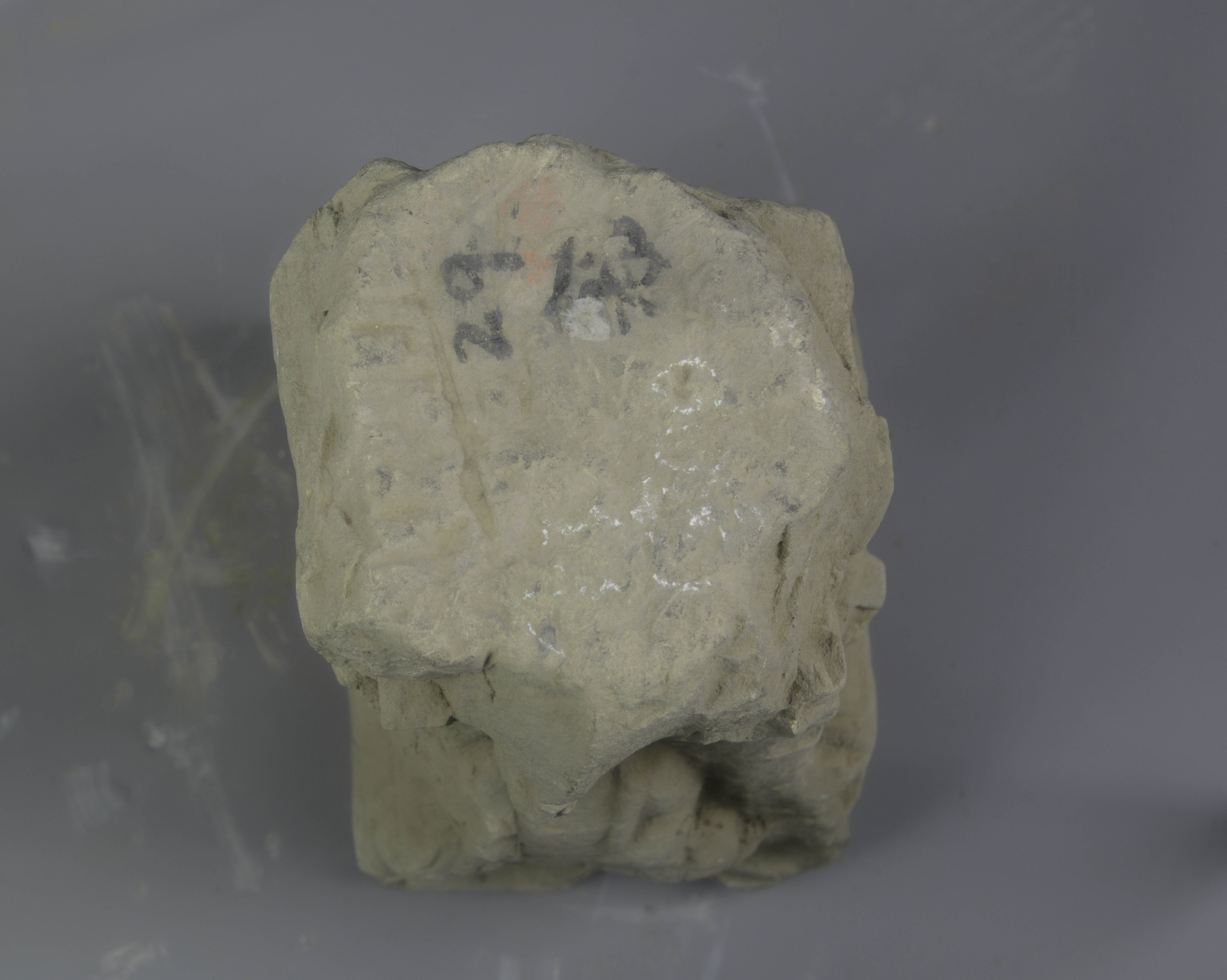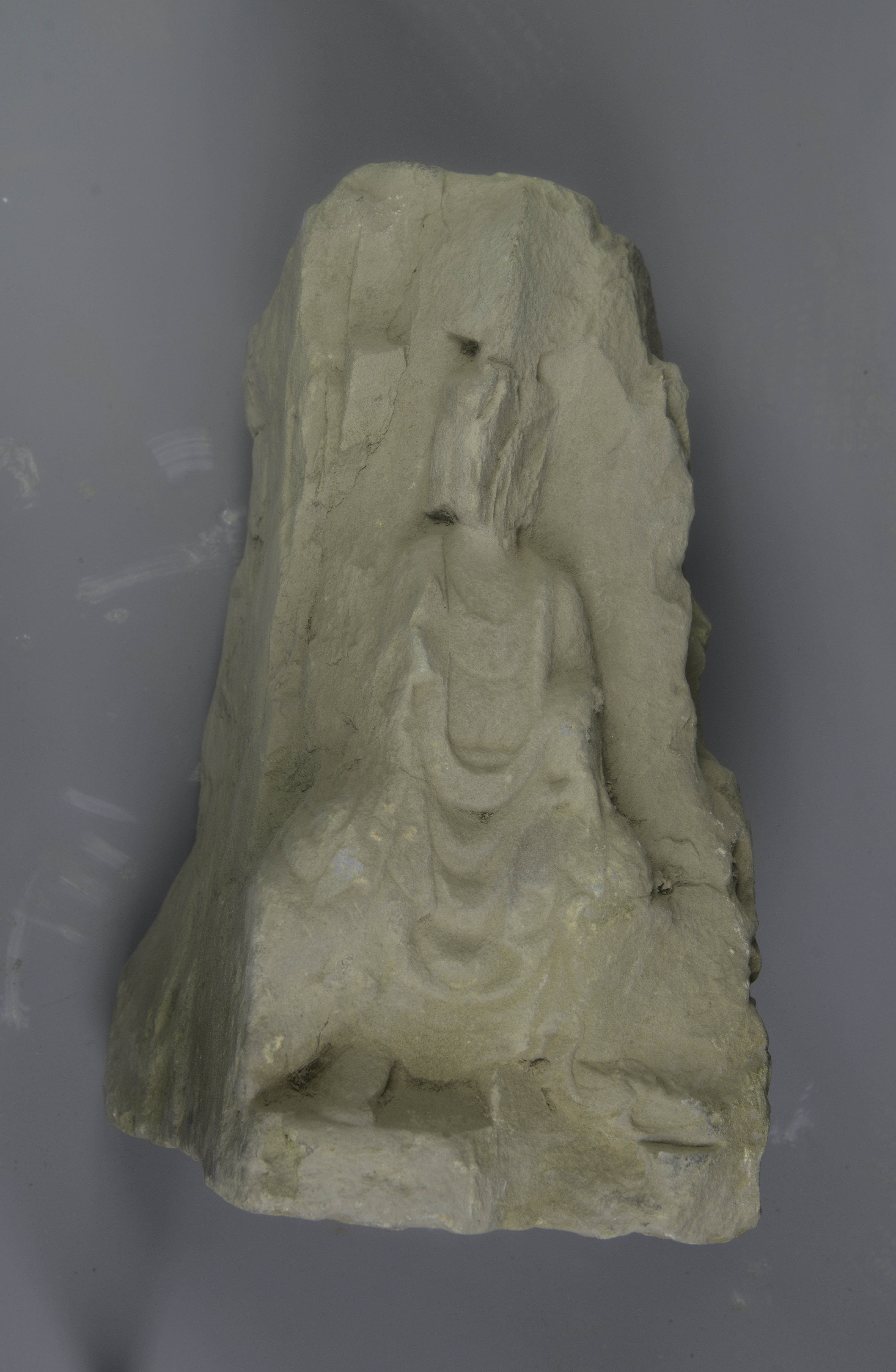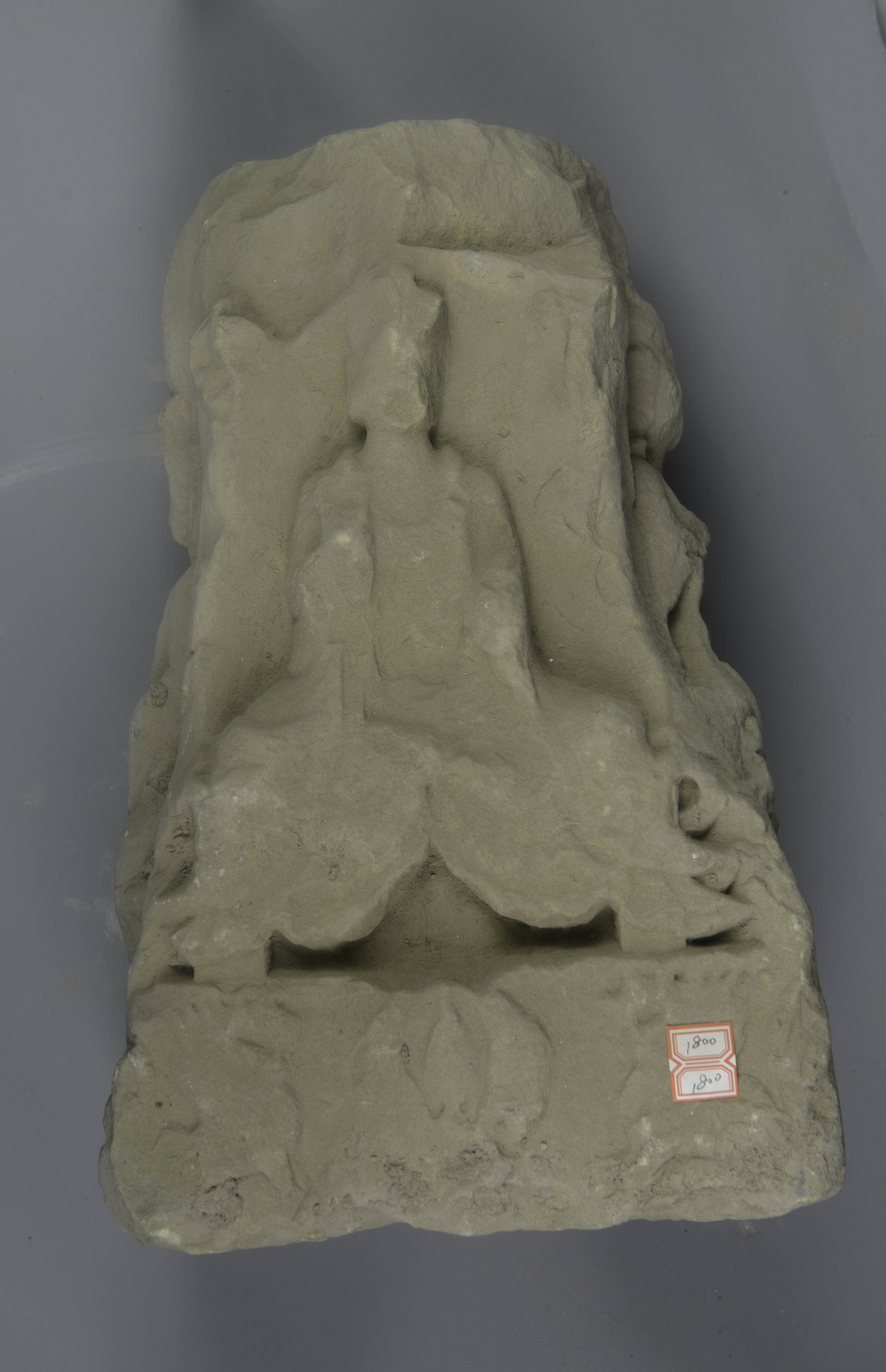 灰黄色细砂岩。三壁存有造像,正壁佛结跏趺坐,施与愿印,龛下雕双狮供宝;左右两壁主尊跣足而生,风化严重,漫漶不清。
