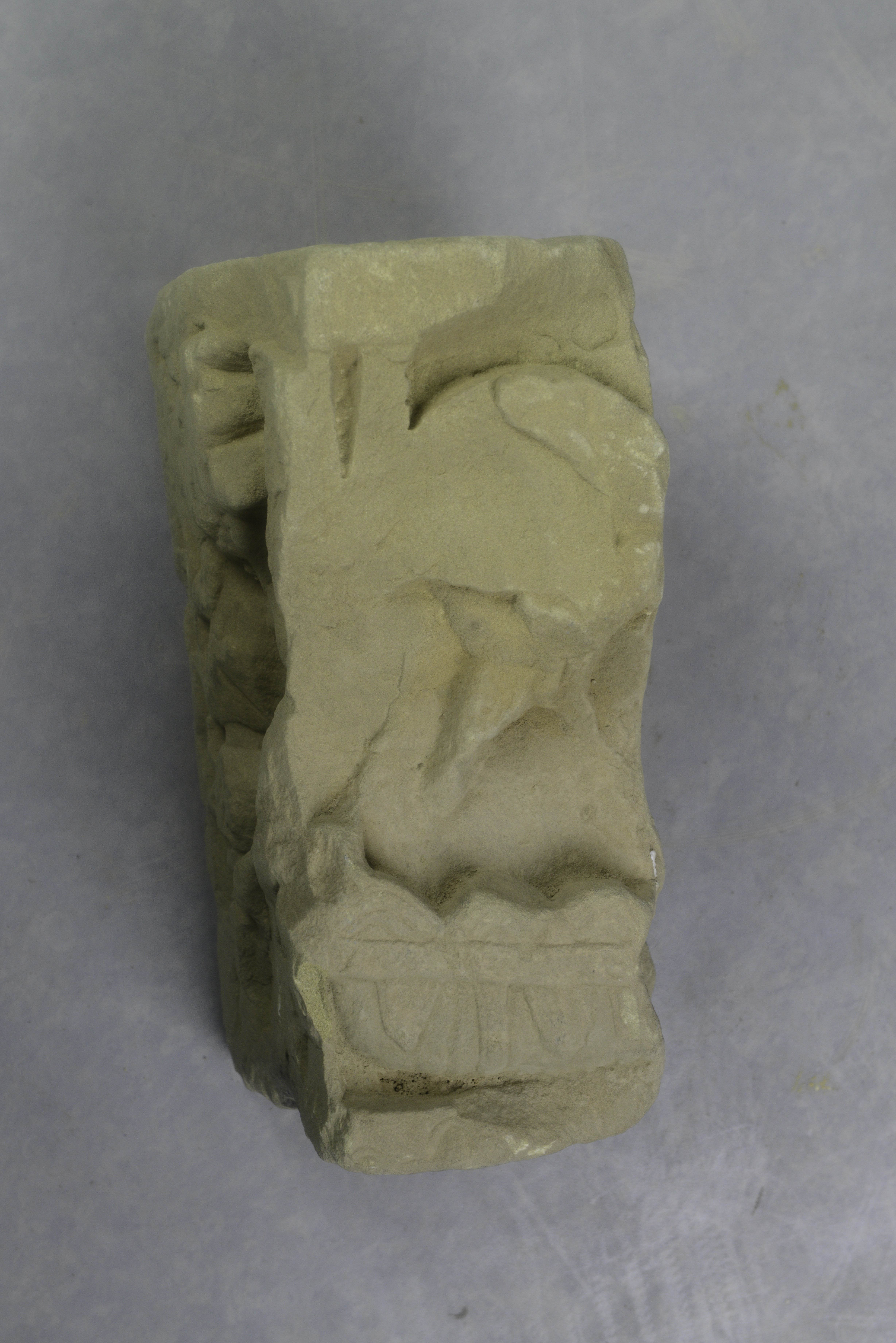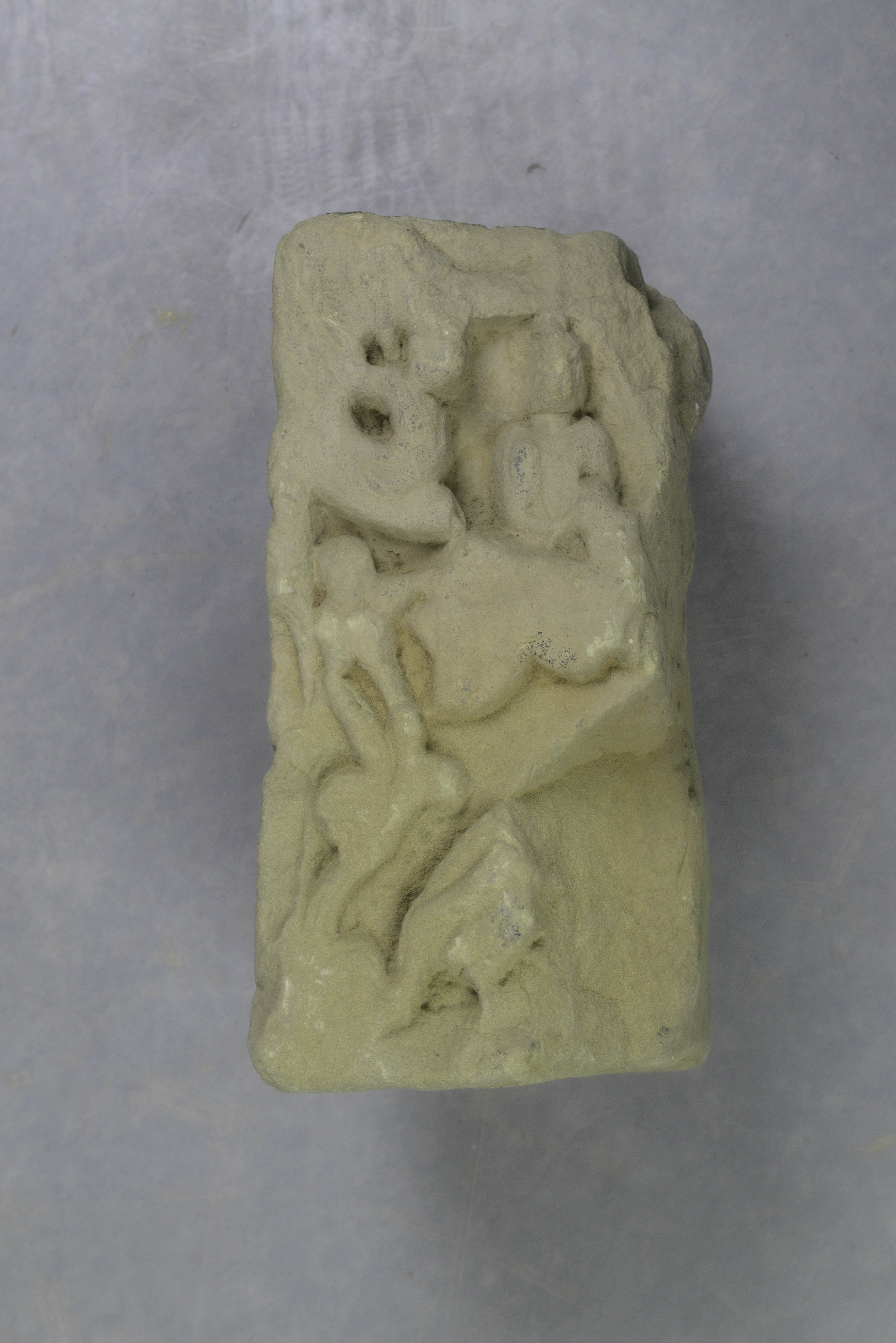 灰黄色砂岩质。风化严重,仅两壁存有造像,一壁雕飞天,一壁似为维摩羯。