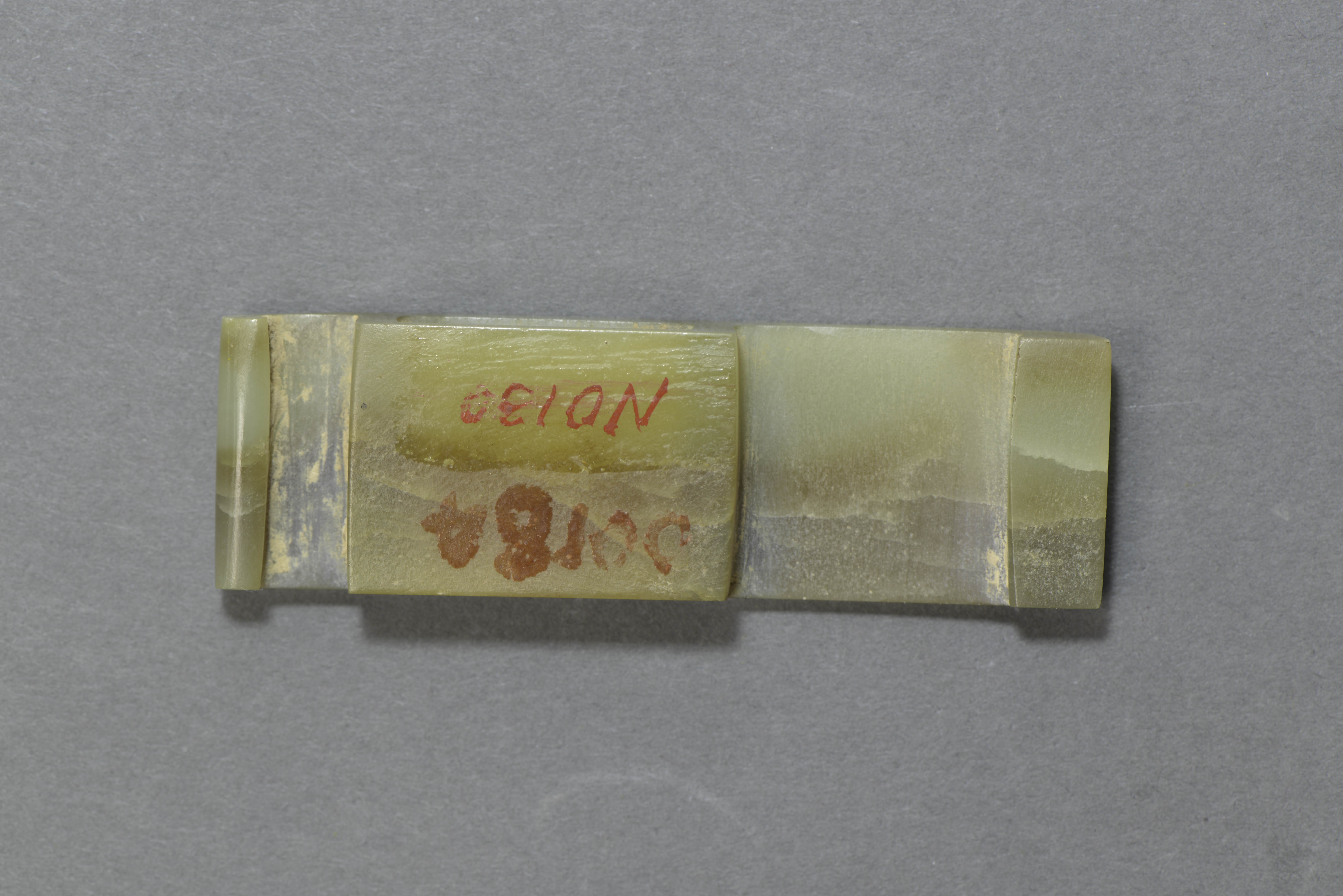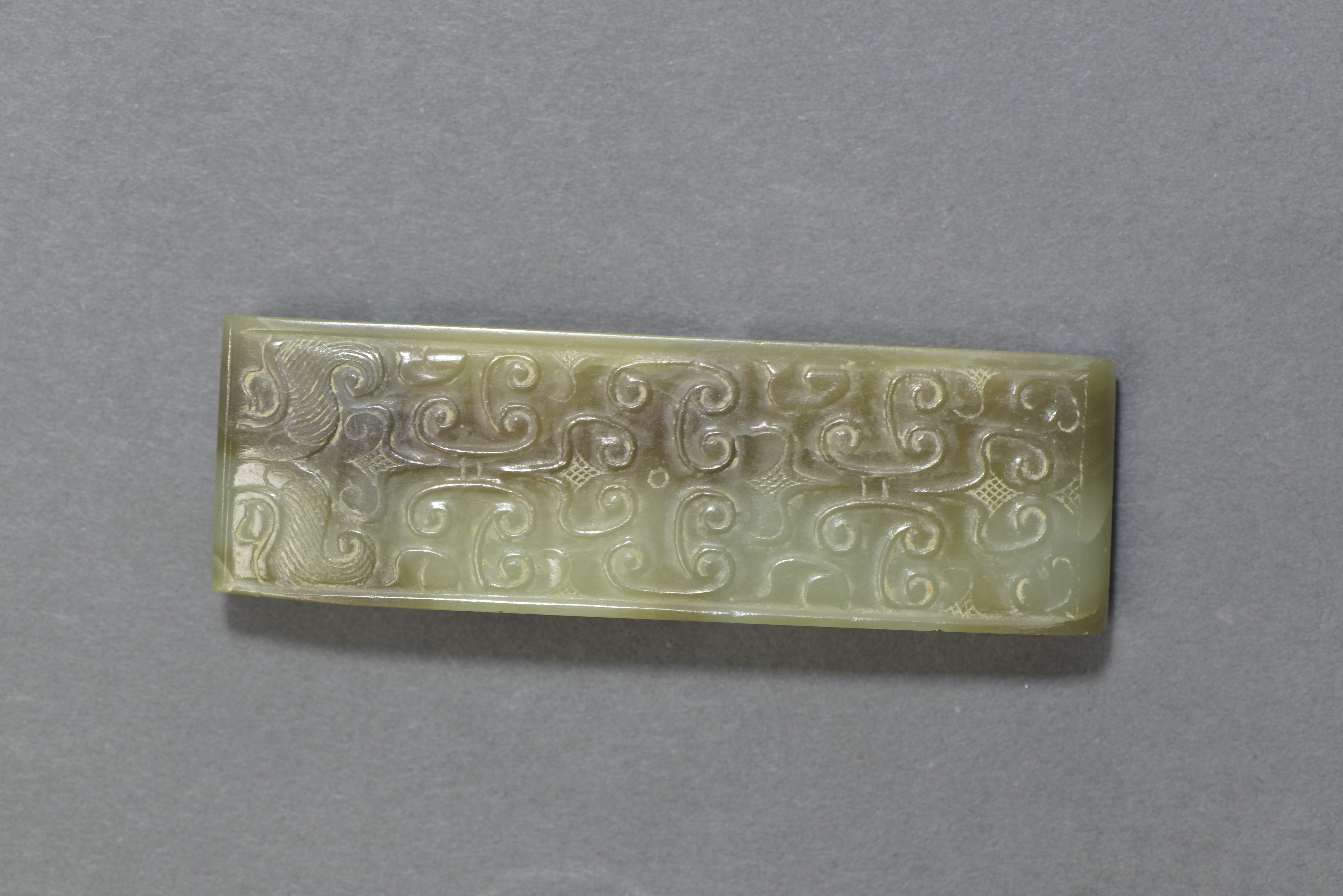 玉质青色,局部土沁泛褐色。长方形,两边下卷,背面有一长方形穿。正面浅浮雕勾连云纹、兽面纹。细部则以阴线刻。