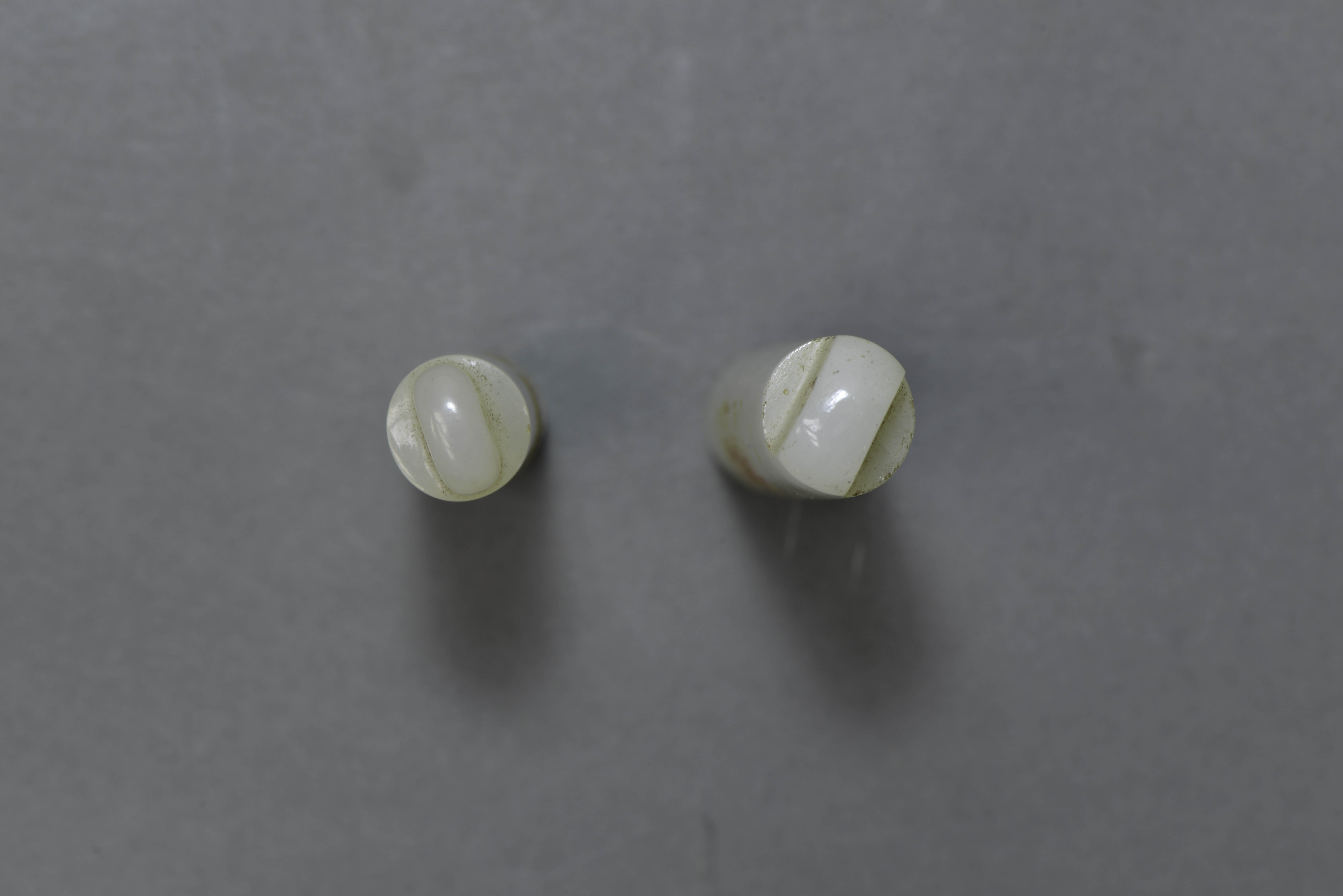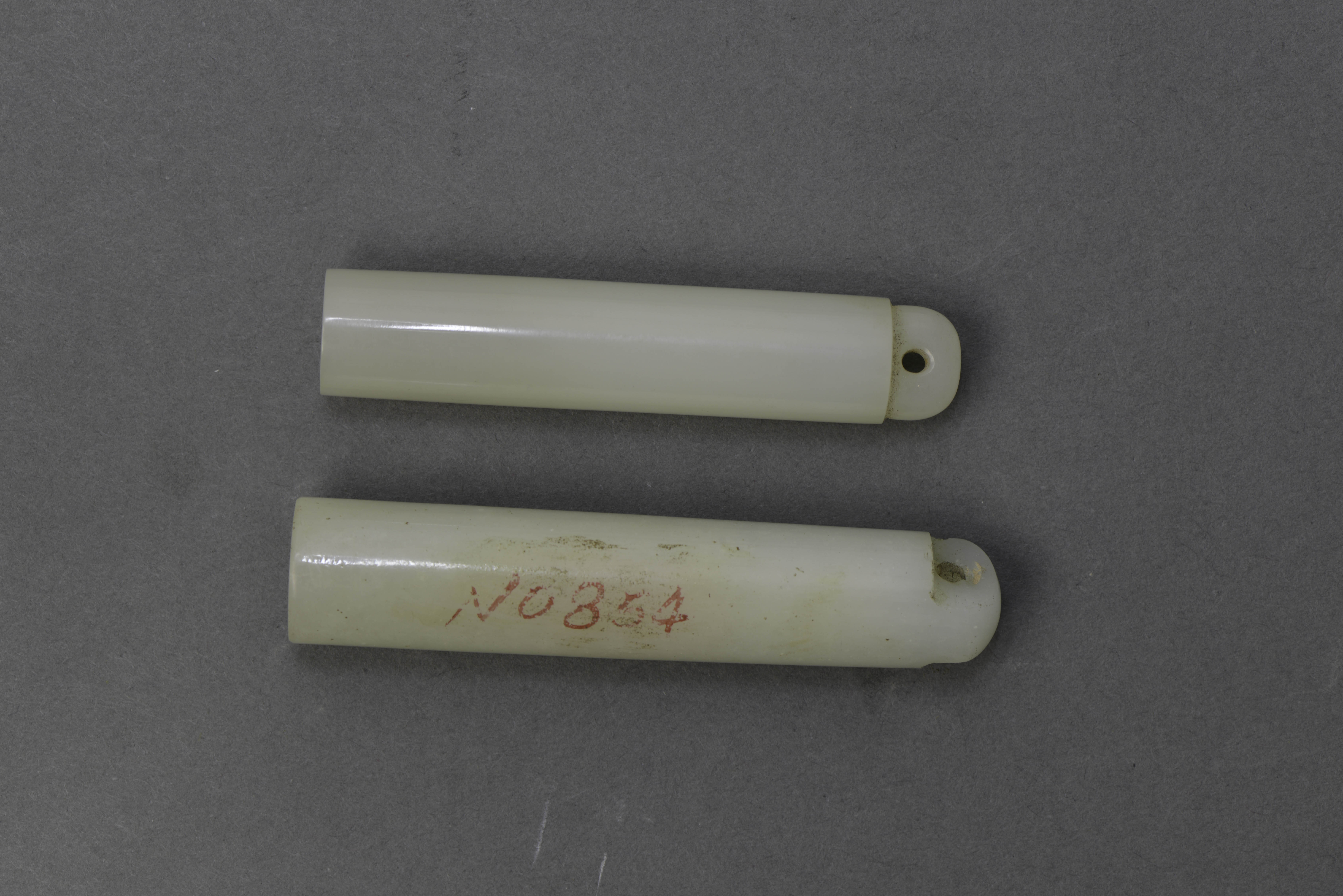 玉质青白色,圆柱形,顶部作一桥形钮,钮上一圆穿。中空。