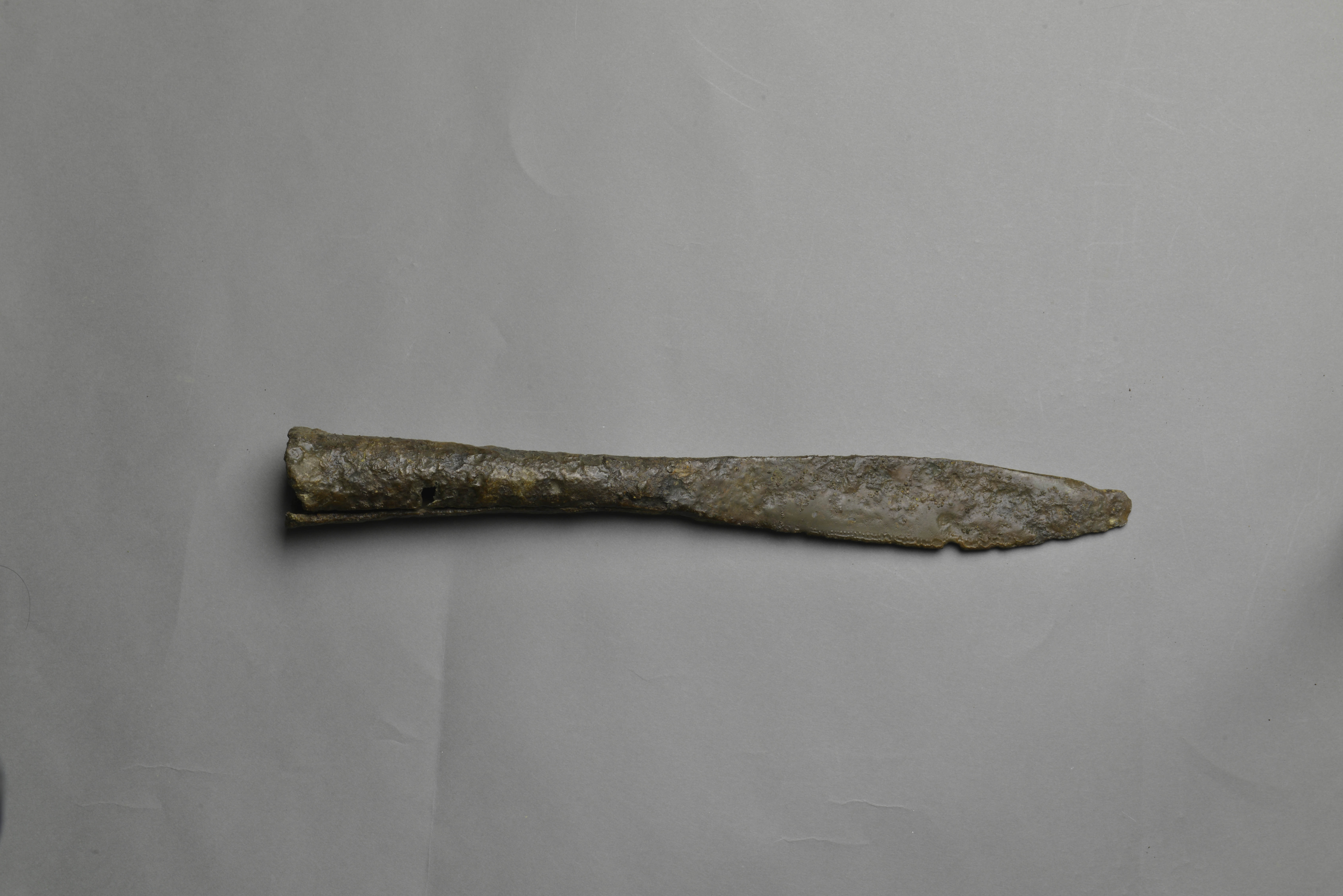 铸铁质。圆形銎口,骹细长,有圆穿,叶窄长,无脊,弧形刃,锋尖锐。
