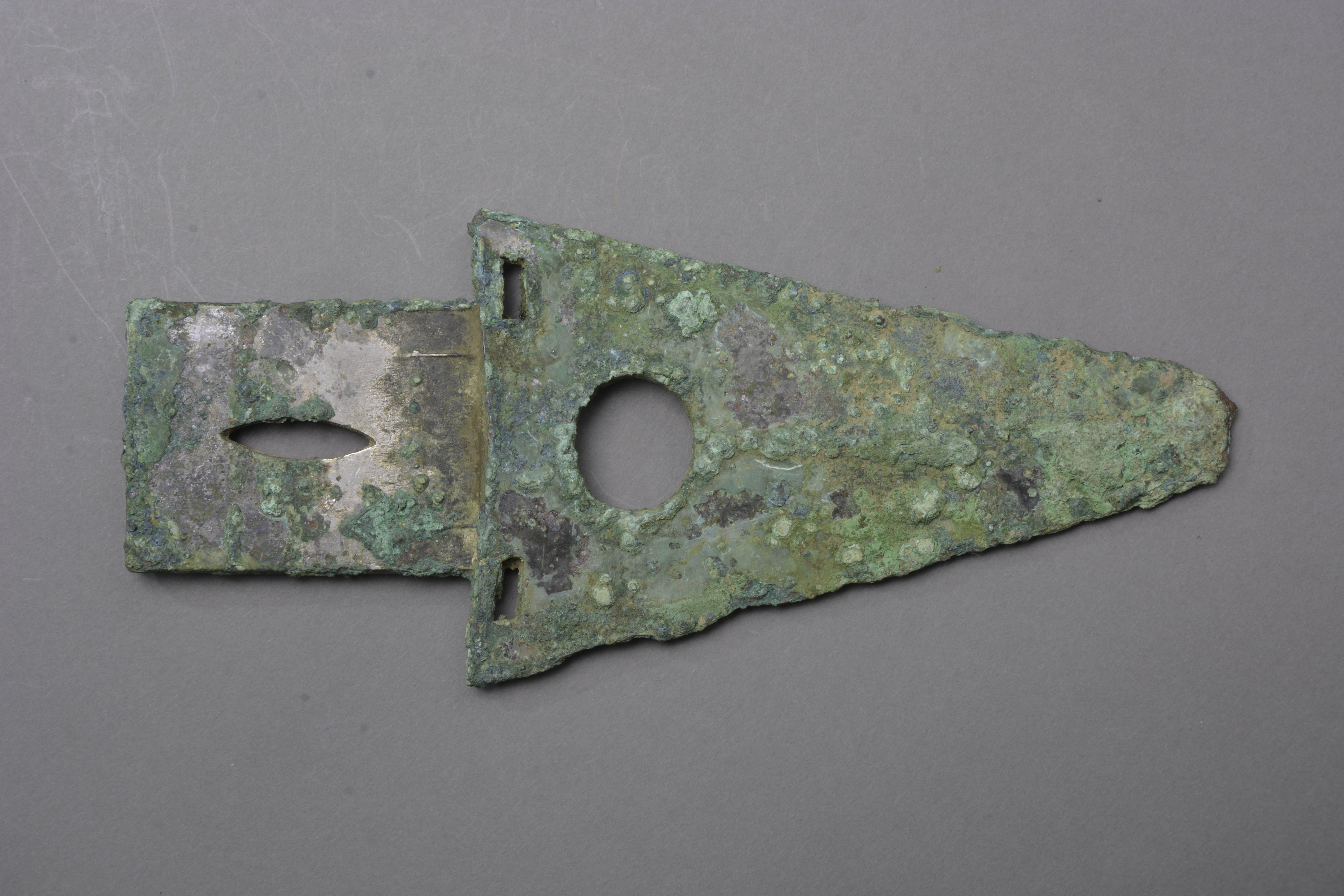 援呈三角形,中部起脊。无胡,方形内。援本上下各一长方形穿,近援本处一圆穿,内上一椭圆形穿。