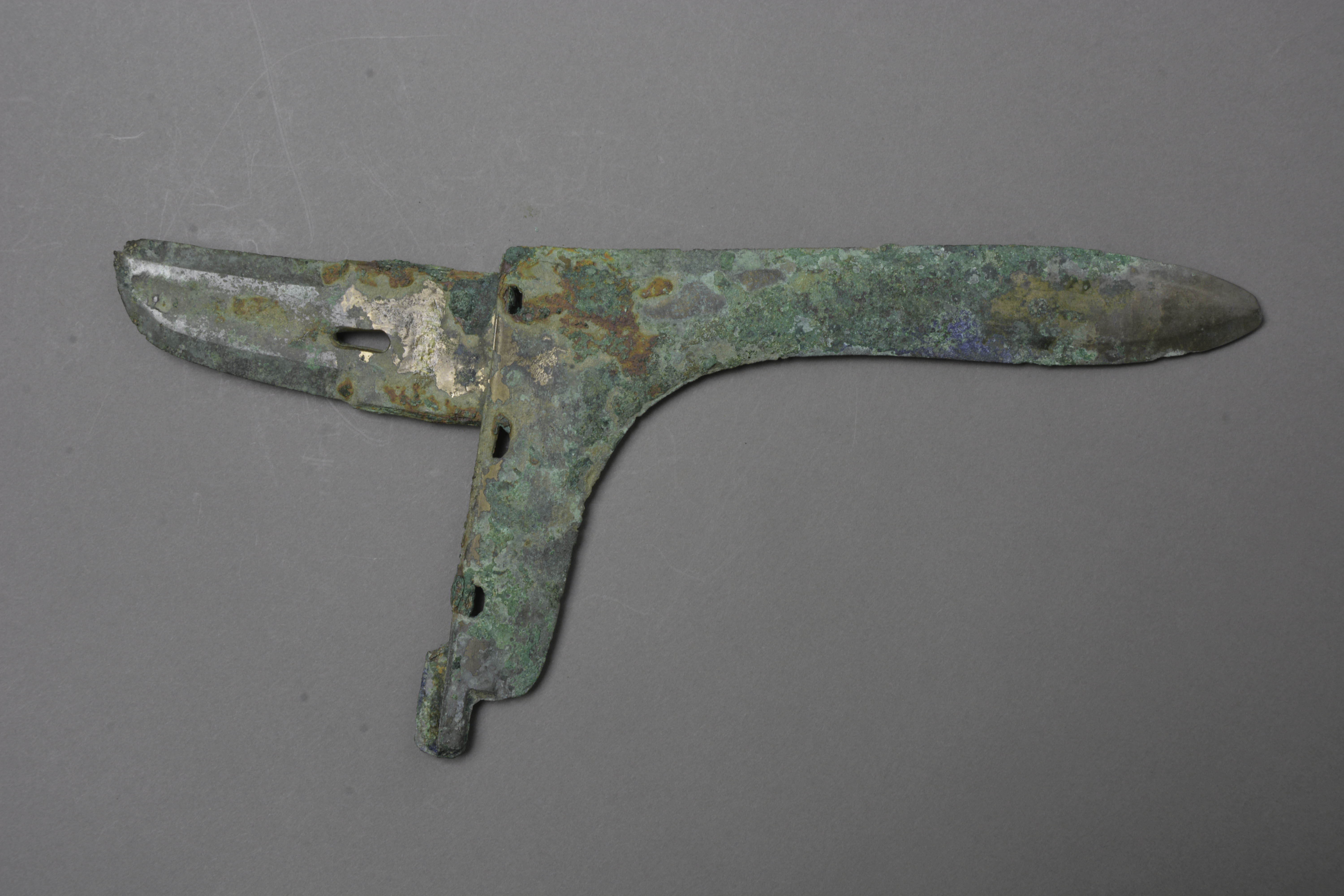 长援,援尖略下弯,中长胡,下阑,阑侧三穿。刀形内,上一长方形穿。