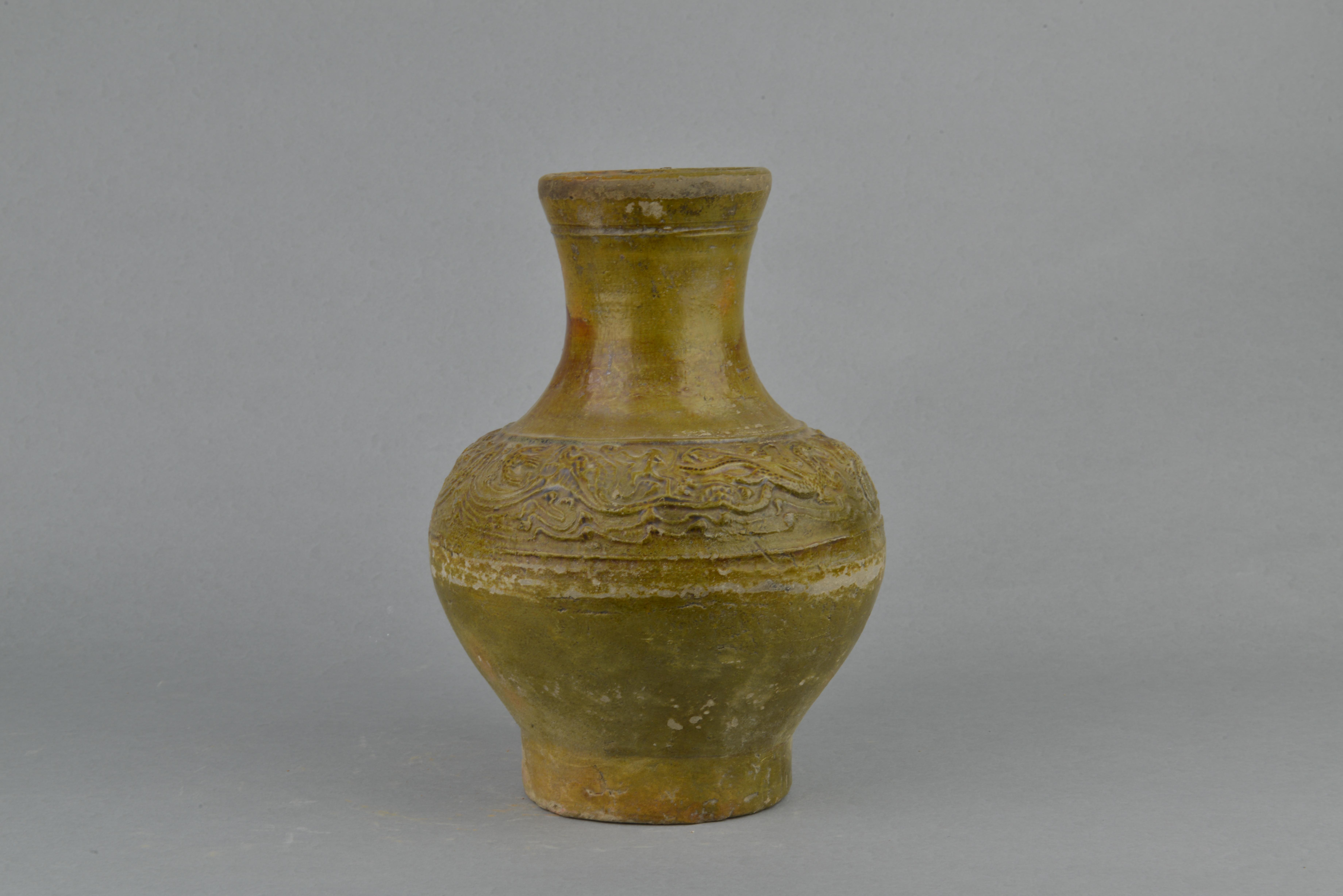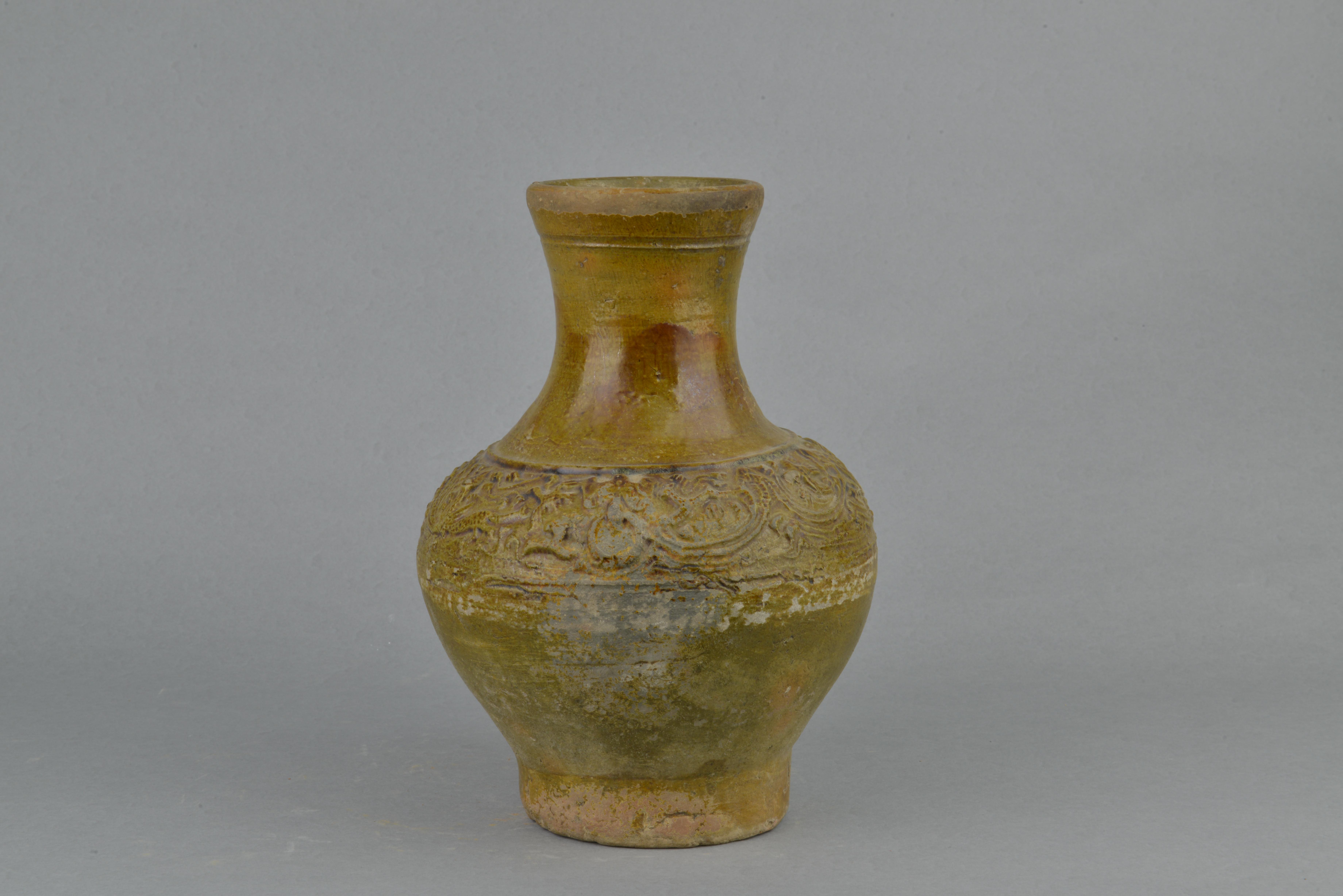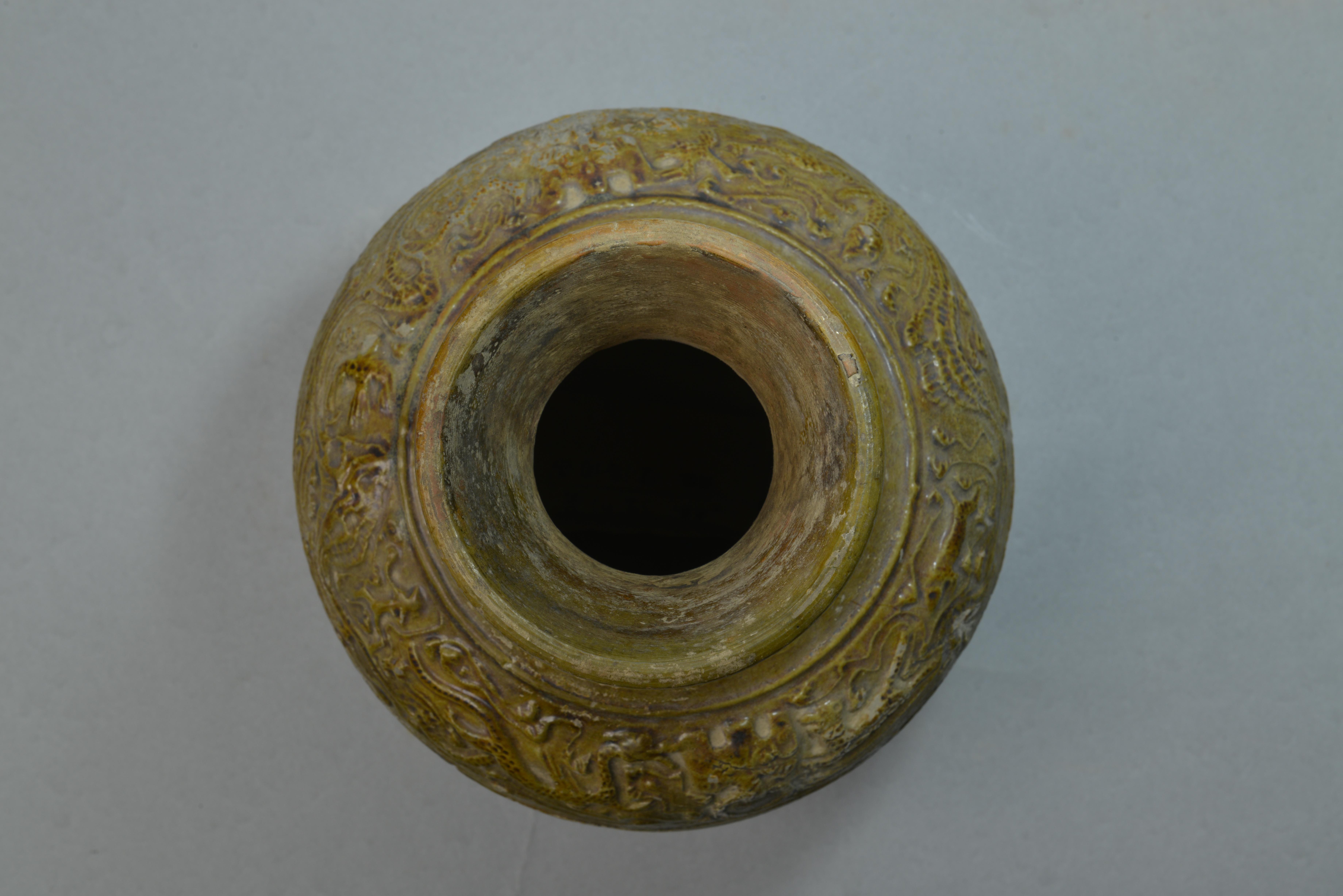 侈口,圆唇,束颈,丰肩,鼓腹下收,假圈足。颈上部饰凹弦纹一周,肩部两周弦纹间饰浅浮雕式龙、虎、燕、鹿、猴豹及禽兽纹和两对称铺首衔环,施黄绿釉,口内丰釉,口外刮釉一圈,底部露红陶胎。