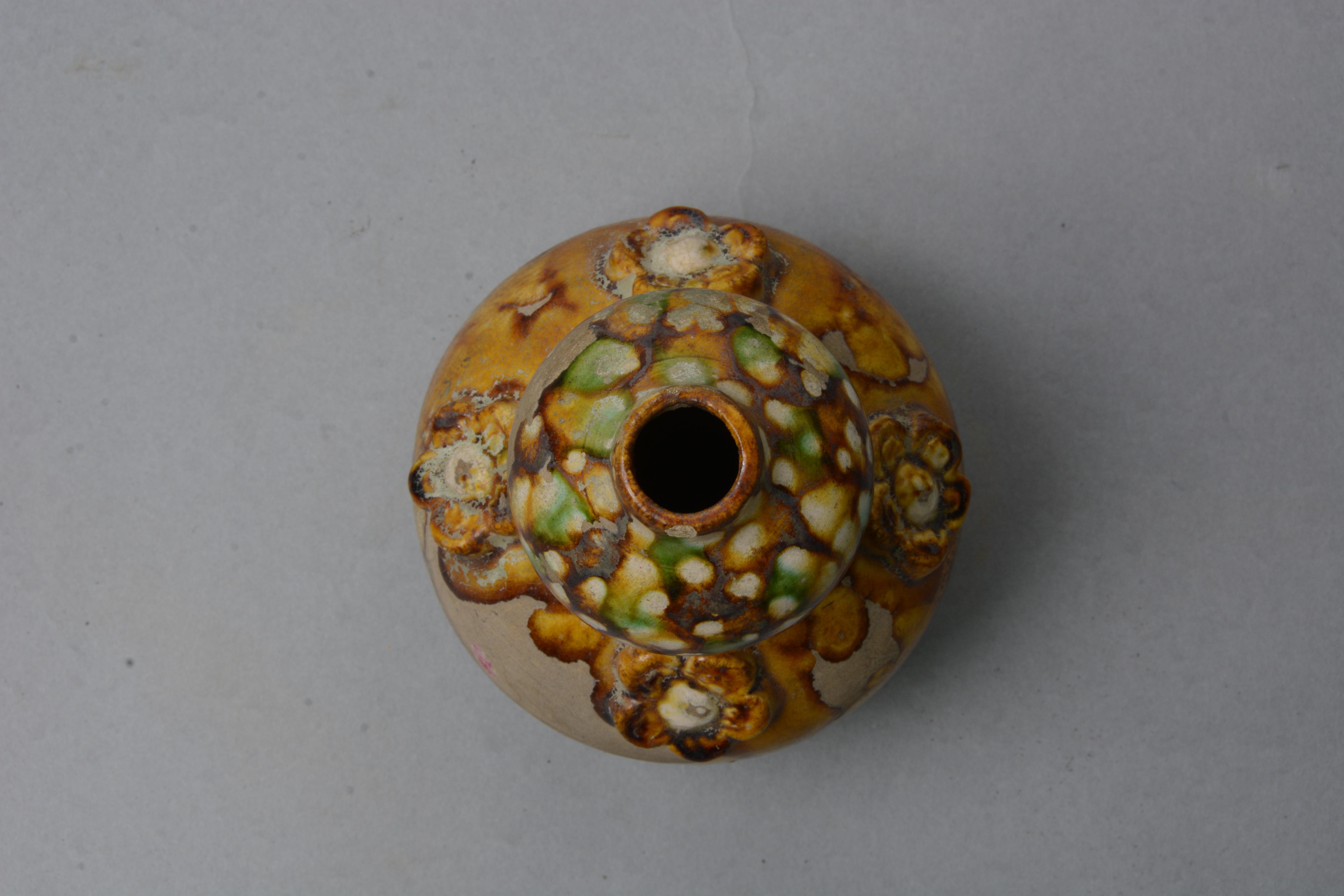器身呈葫芦形,小口,饼形足。腹部堆塑四朵梅花,施黄、绿、白三色釉,釉间局部及腹下部、底足露胎。