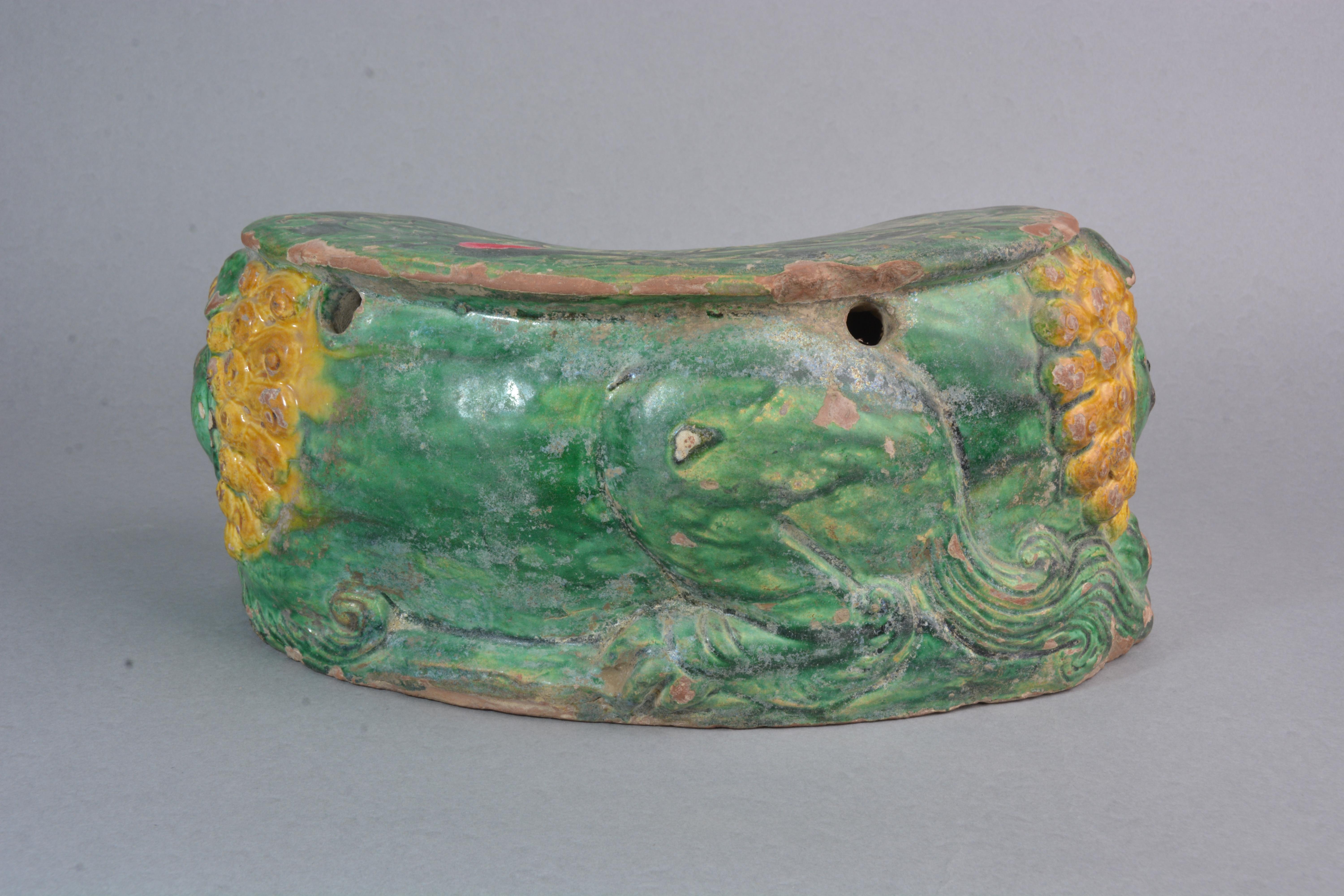 枕略呈弓形,作两背向连体蹲伏狮形,平面,平底。枕面黑彩勾画折枝莲纹,填深绿彩,通体施琉璃质绿、黄二色釉,底部露泥质红陶胎。