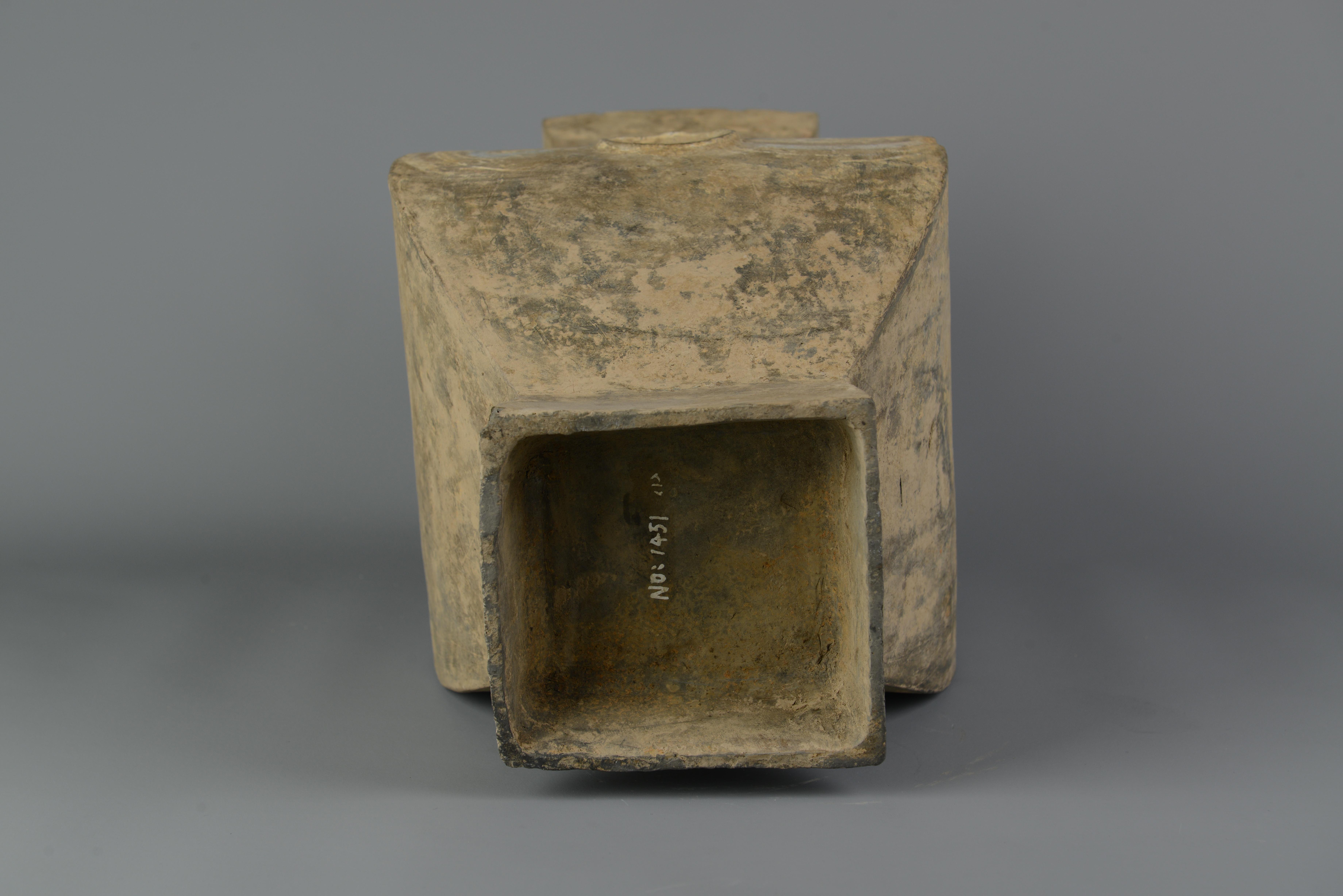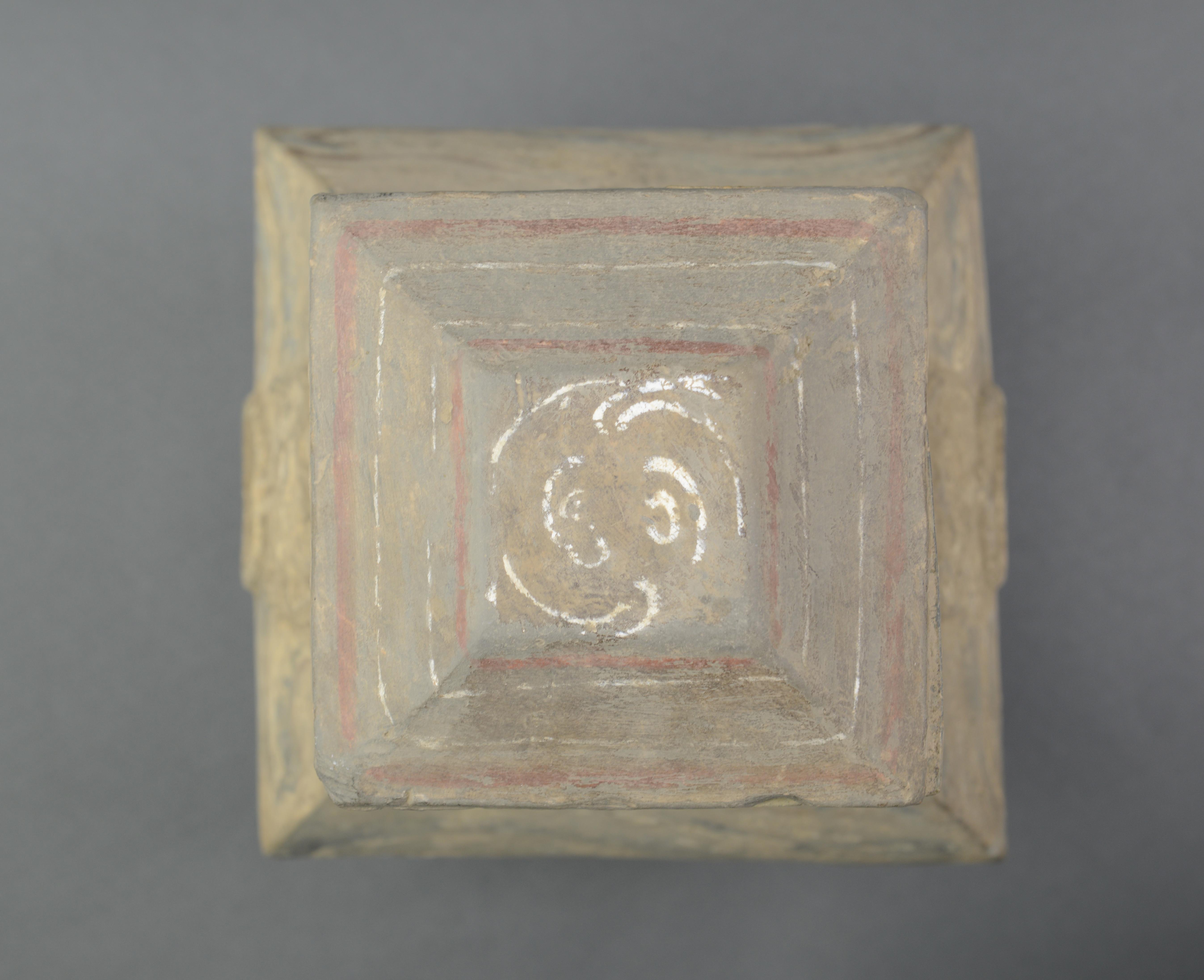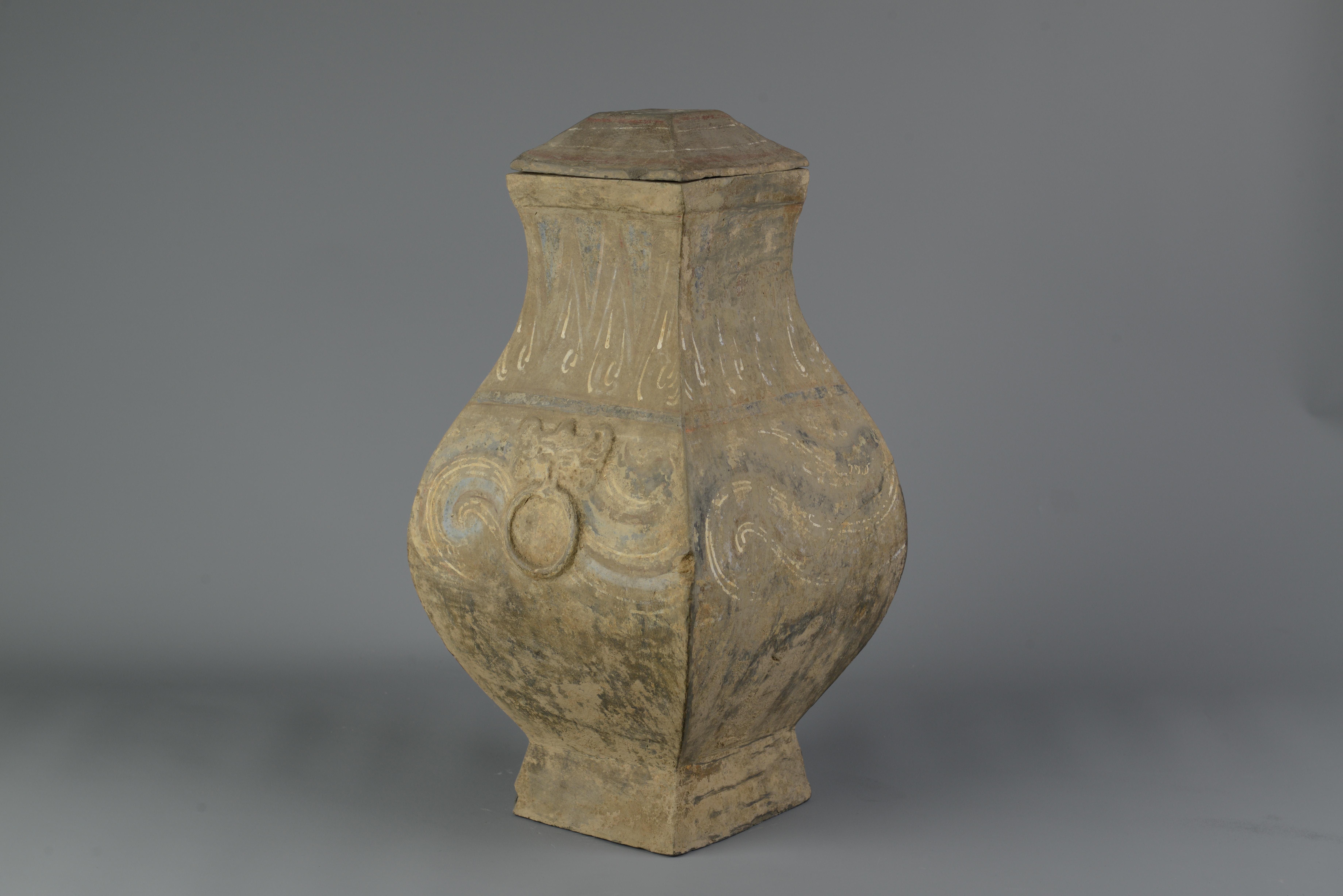 侈口,方唇,上扣合盝顶式盖,束颈,鼓腹,腹中部作一对浅浮雕铺首衔环,圈足外撇。盖顶饰白色卷云纹和红、白色弦纹;颈部红、白、绿三色绘三角纹和卷云纹,腹部以红、白、绿三色饰绘卷云纹带。
