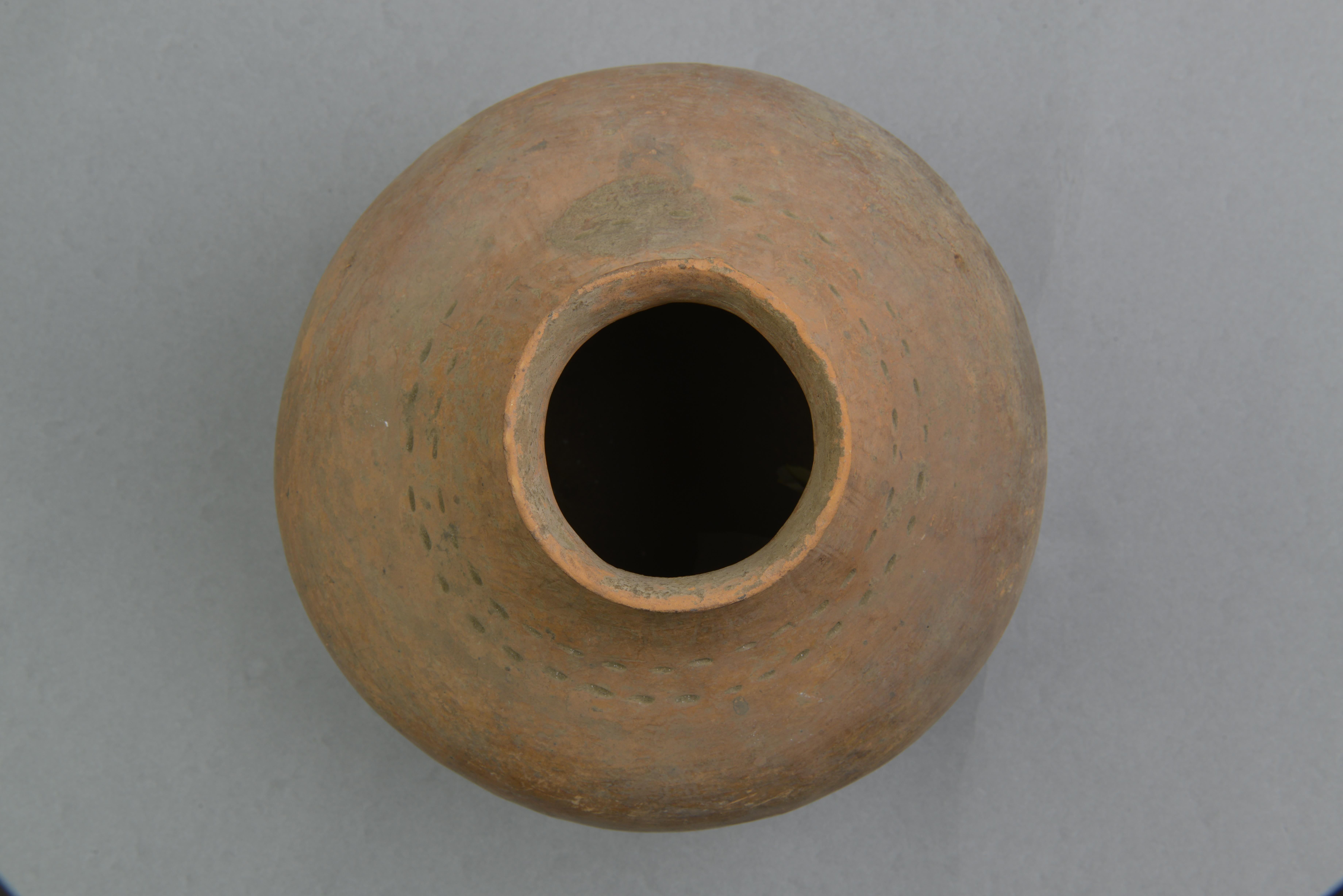 泥质红陶,喇叭口,平折沿,细颈,折肩,斜深腹,尖底。颈部饰一周剔刺纹,肩部饰细交叉绳纹,施“习”字形白彩,腹、底部饰细竖绳纹,腹部大面积磨光。