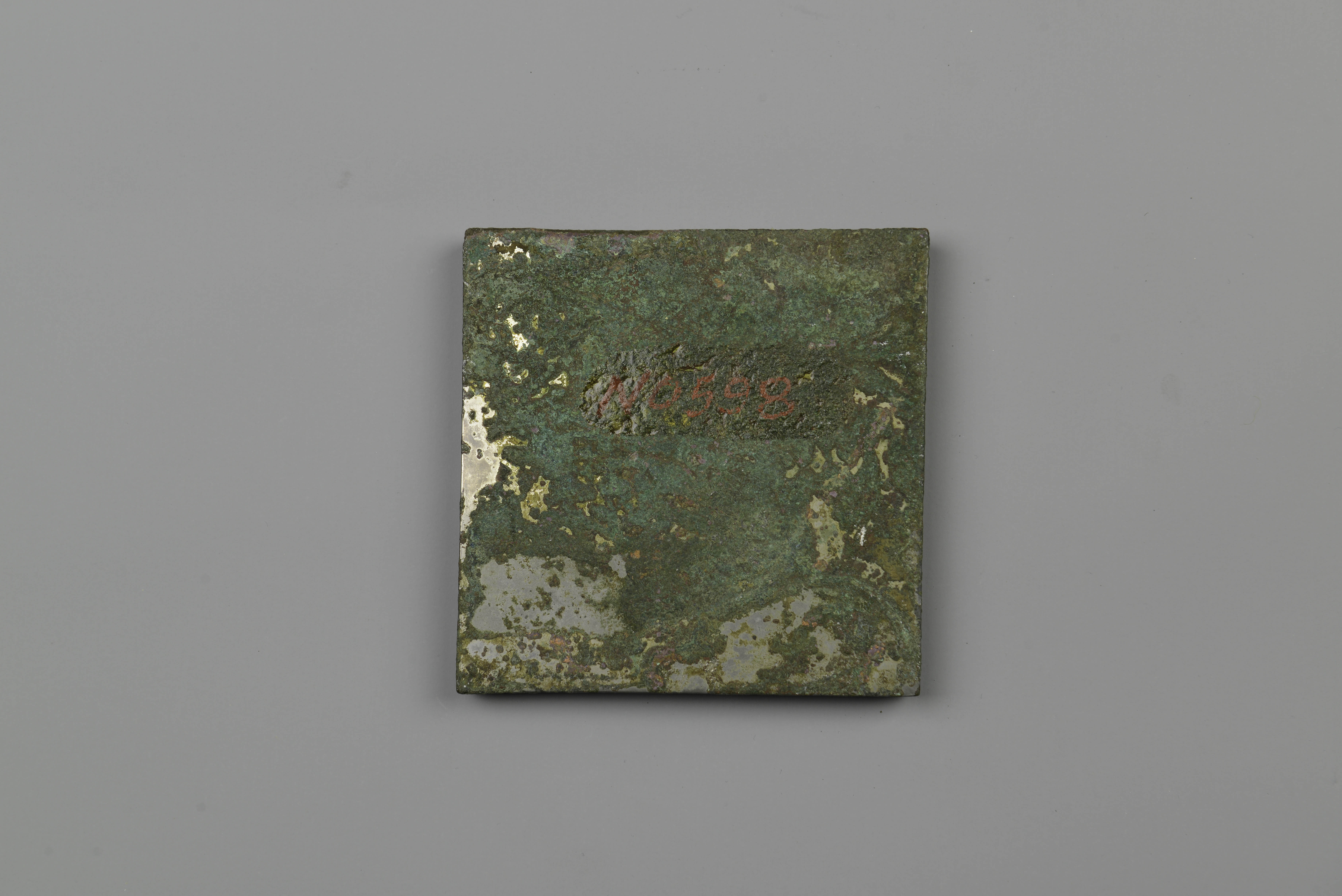 - 内容:方形,伏兽钮,钮外由一凸起方框分为内外两区,内区四瑞兽追尾环列,四角饰孔雀屏纹,其系空间点缀十四串枝蔓缠连的葡萄纹;外区饰三十三串枝蔓缠连的葡萄和十二禽鸟,禽鸟六飞六栖,造型生动,四角饰孔雀屏纹。