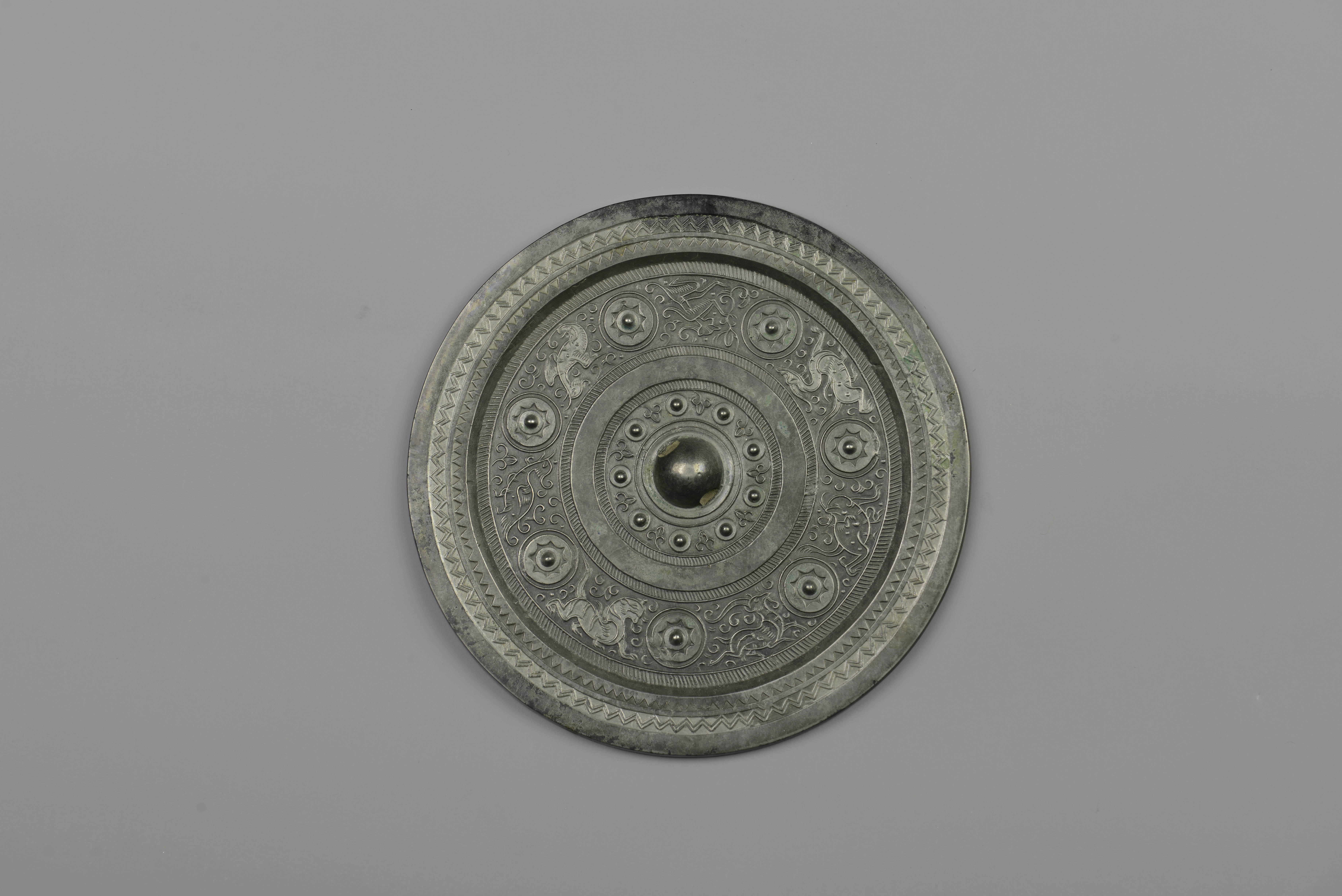 - 内容:圆形,圆钮,圆钮座。钮座外九枚圆座小乳钉和花蕾纹相间环绕。其外为两周短斜线纹夹一周宽弦纹带。再外主纹为七枚有内向连弧纹圆座的乳钉,其间云气纹衬地,饰以(右旋)执花草的羽人,昂首蹲伏的青龙、蟾蜍形瑞兽,羊形独角兽,俯首奔走的白虎,蹲立鸣叫的神鸟和振翅欲飞的朱雀。最外为一周短斜线纹。宽缘饰锯齿纹和双线复波纹各一周。