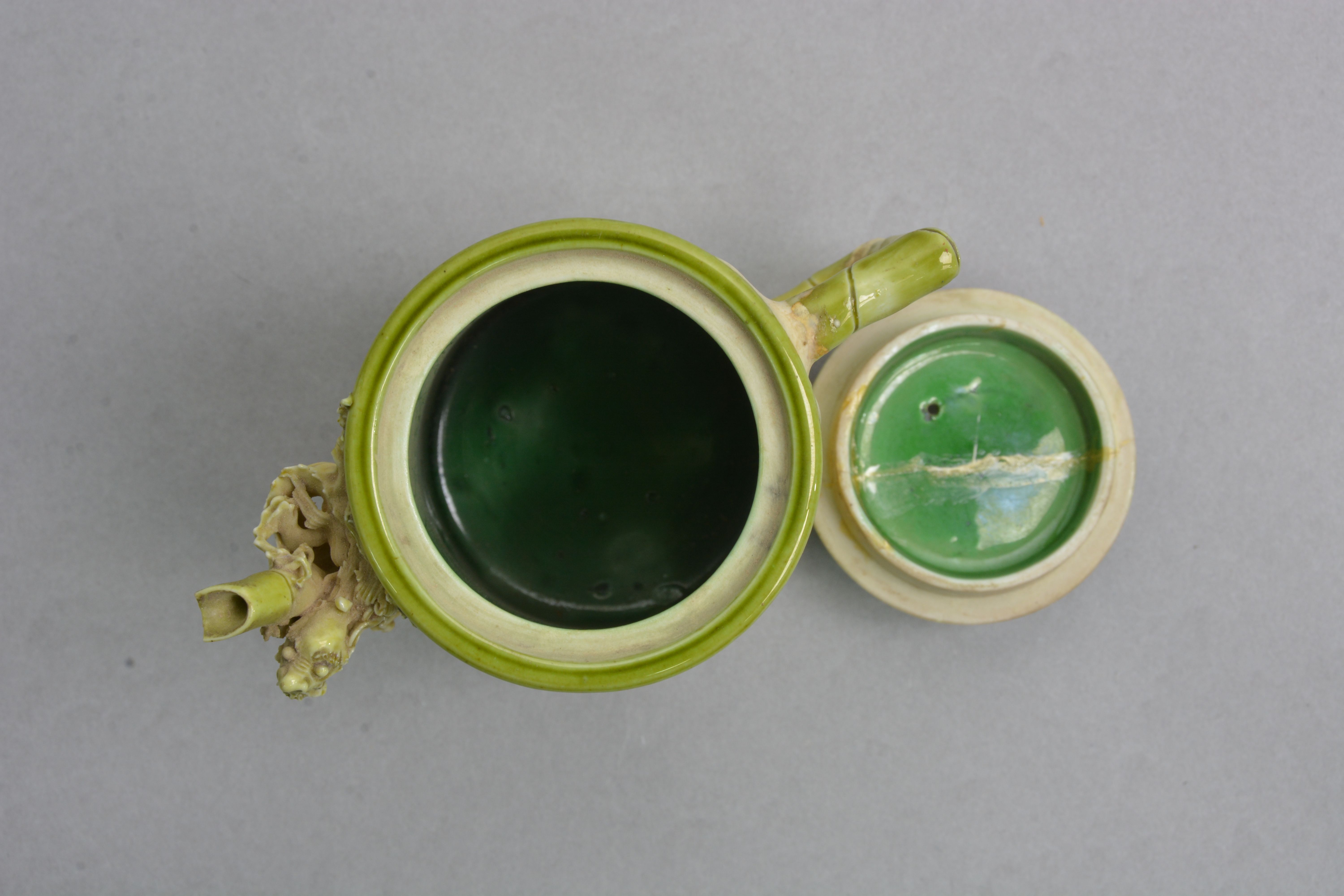 子母口,竹节状直筒腹,腹左侧下部三分之一处出长曲流,沿腹壁上扬,右侧作方执,流、执均呈竹枝形,矮圈足。盖顶堆塑花钮,钮旁有一小气孔;绕流堆塑卷龙一条,龙首上扬,造型生动;腹壁饰浅浮雕竹枝蝴蝶图案,底部有阳文“乾隆年制”篆书款。器表施黄绿釉,内施绿釉,盖沿下及足圈露胎,白胎细腻,釉色莹润。