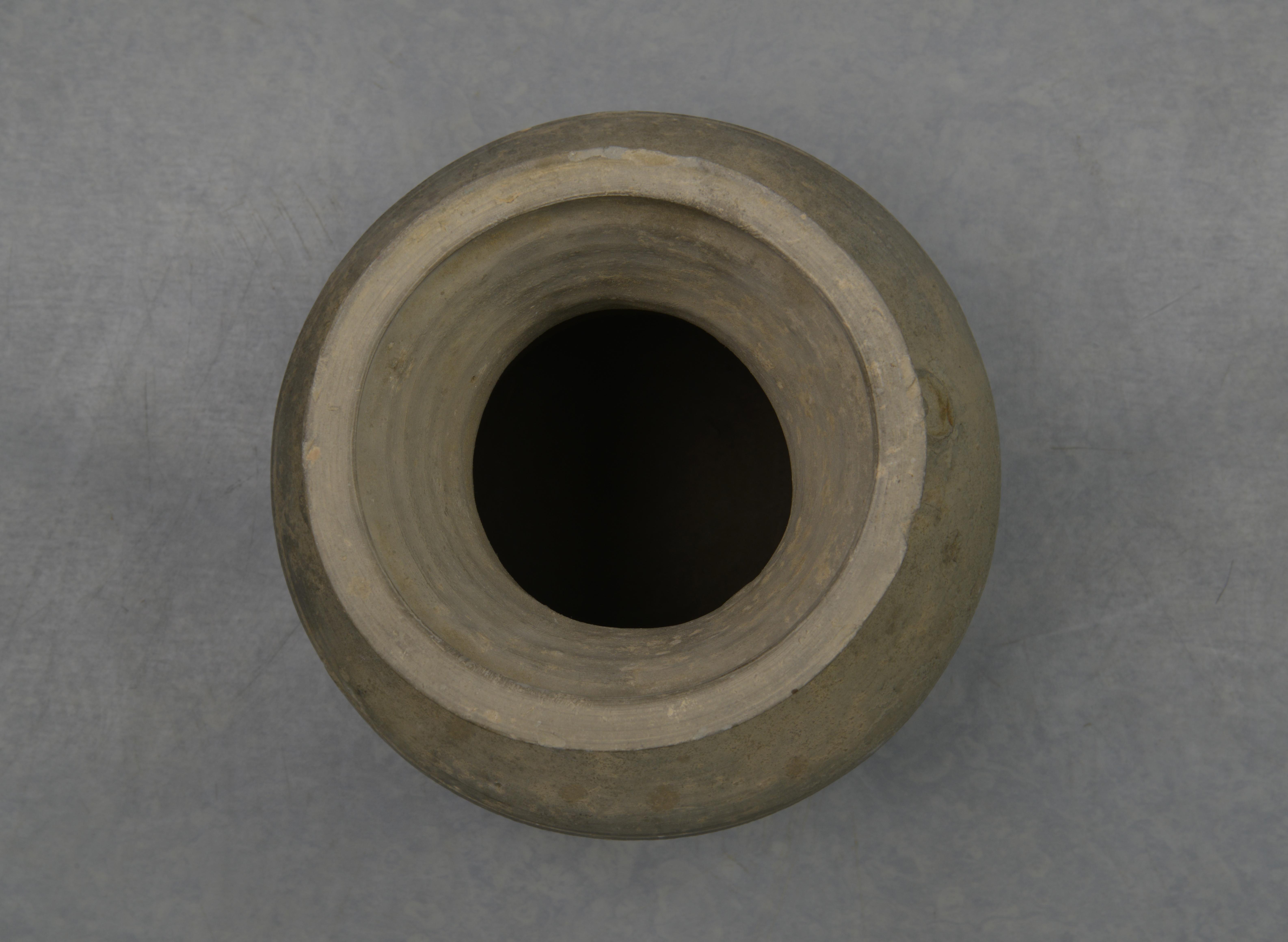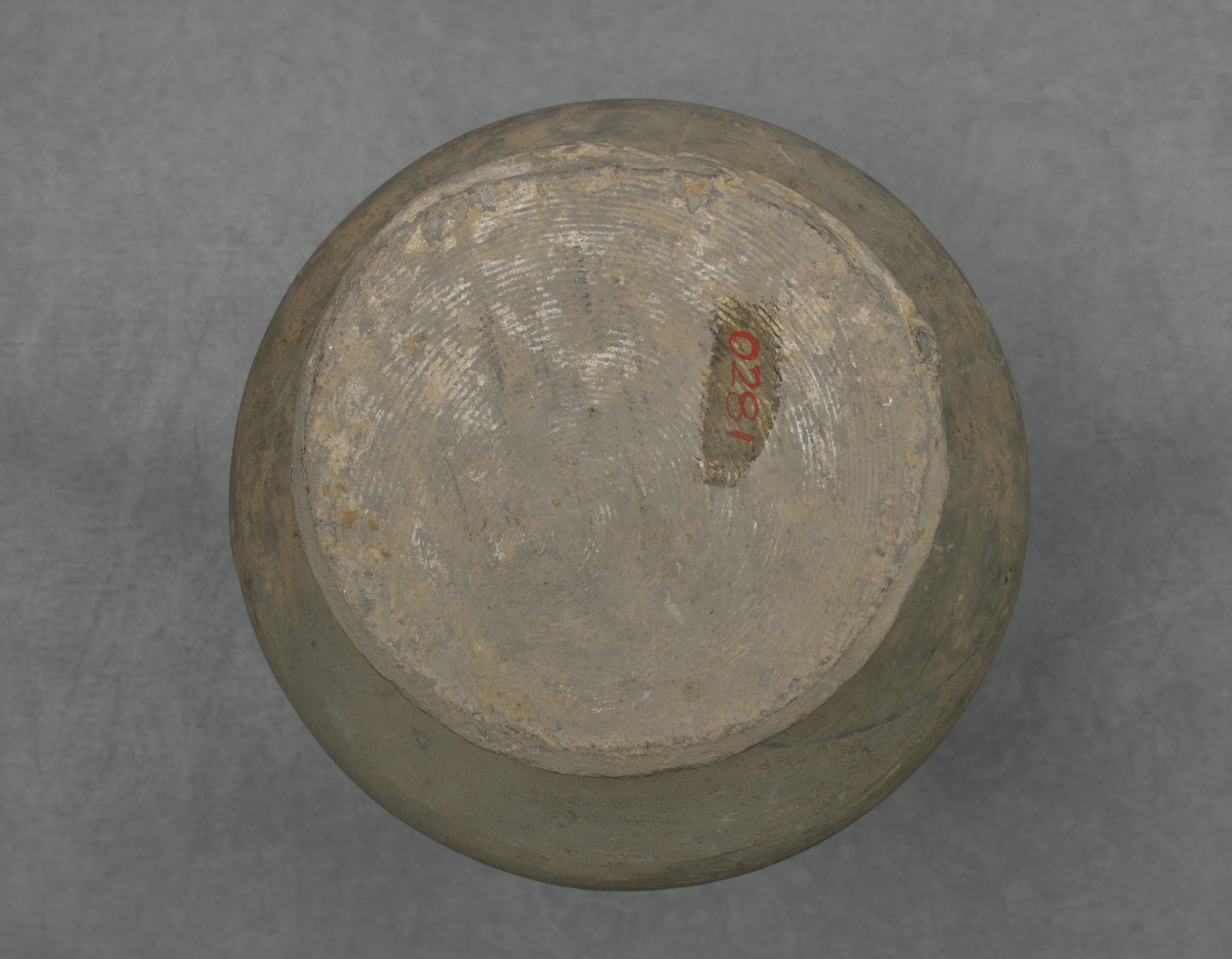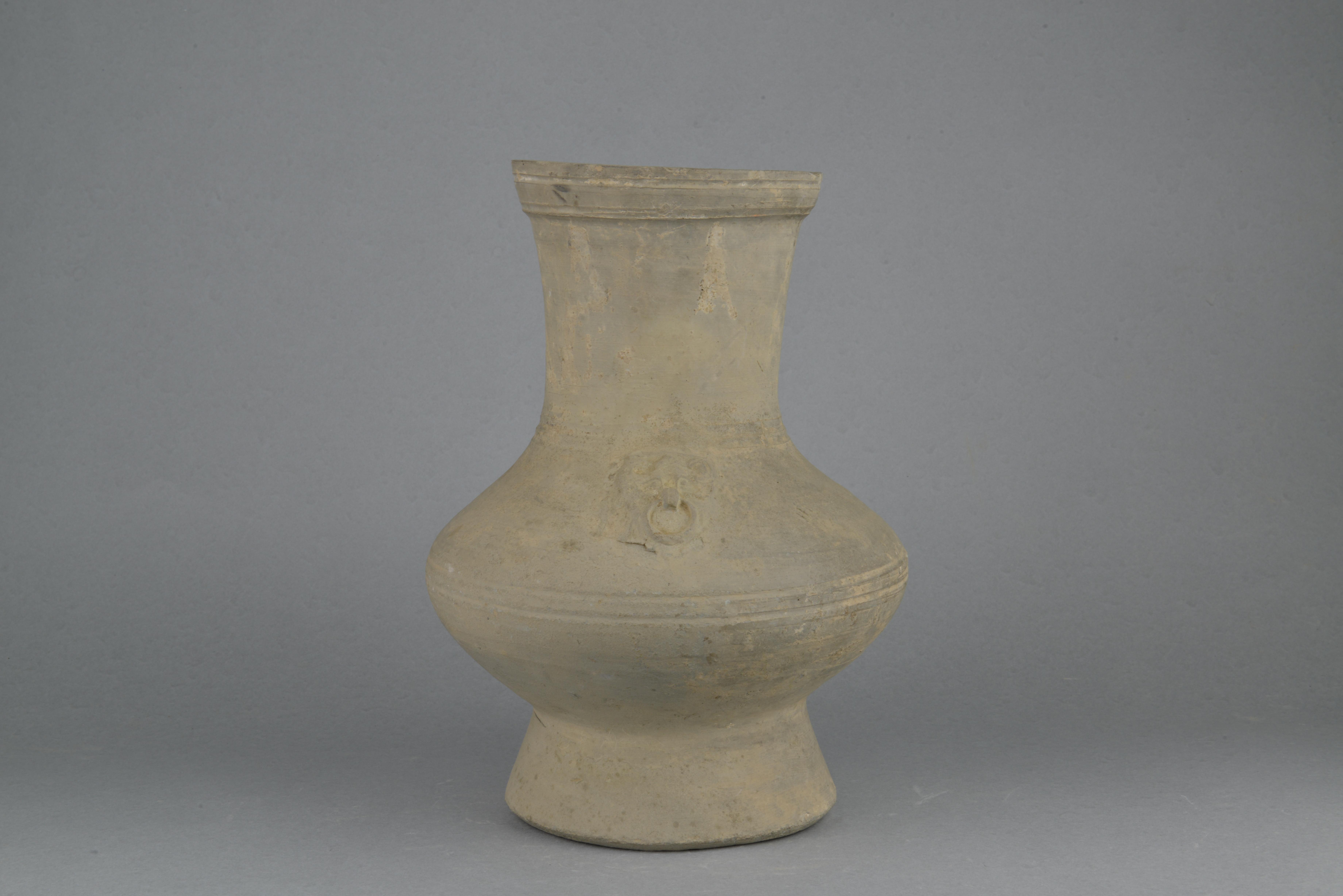 泥质灰陶。盘形口,长粗颈,扁鼓腹,假圈足外撇,平底内凹。口、颈、腹部饰三组六周凹弦纹,肩部堆塑两对称铺首衔环。