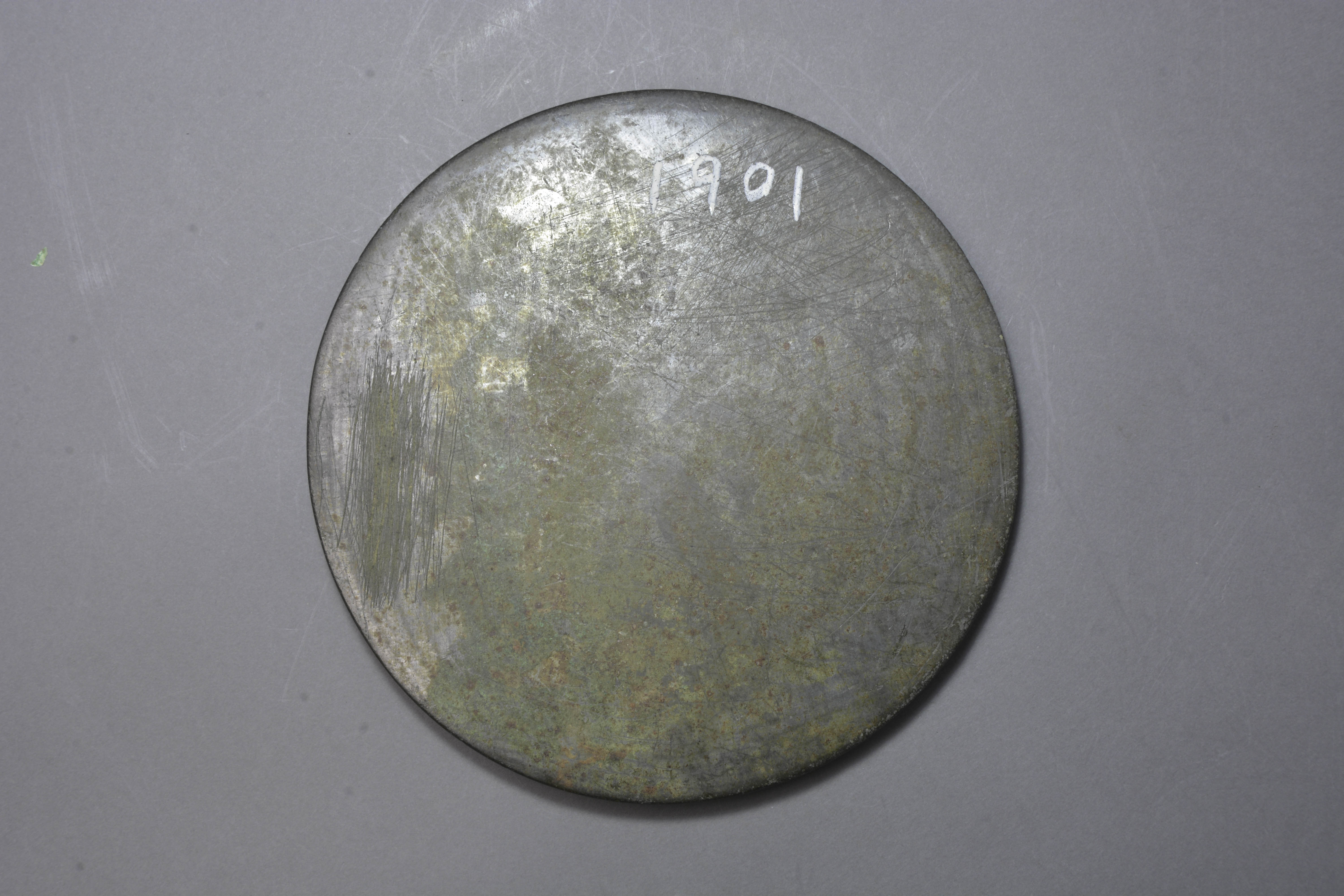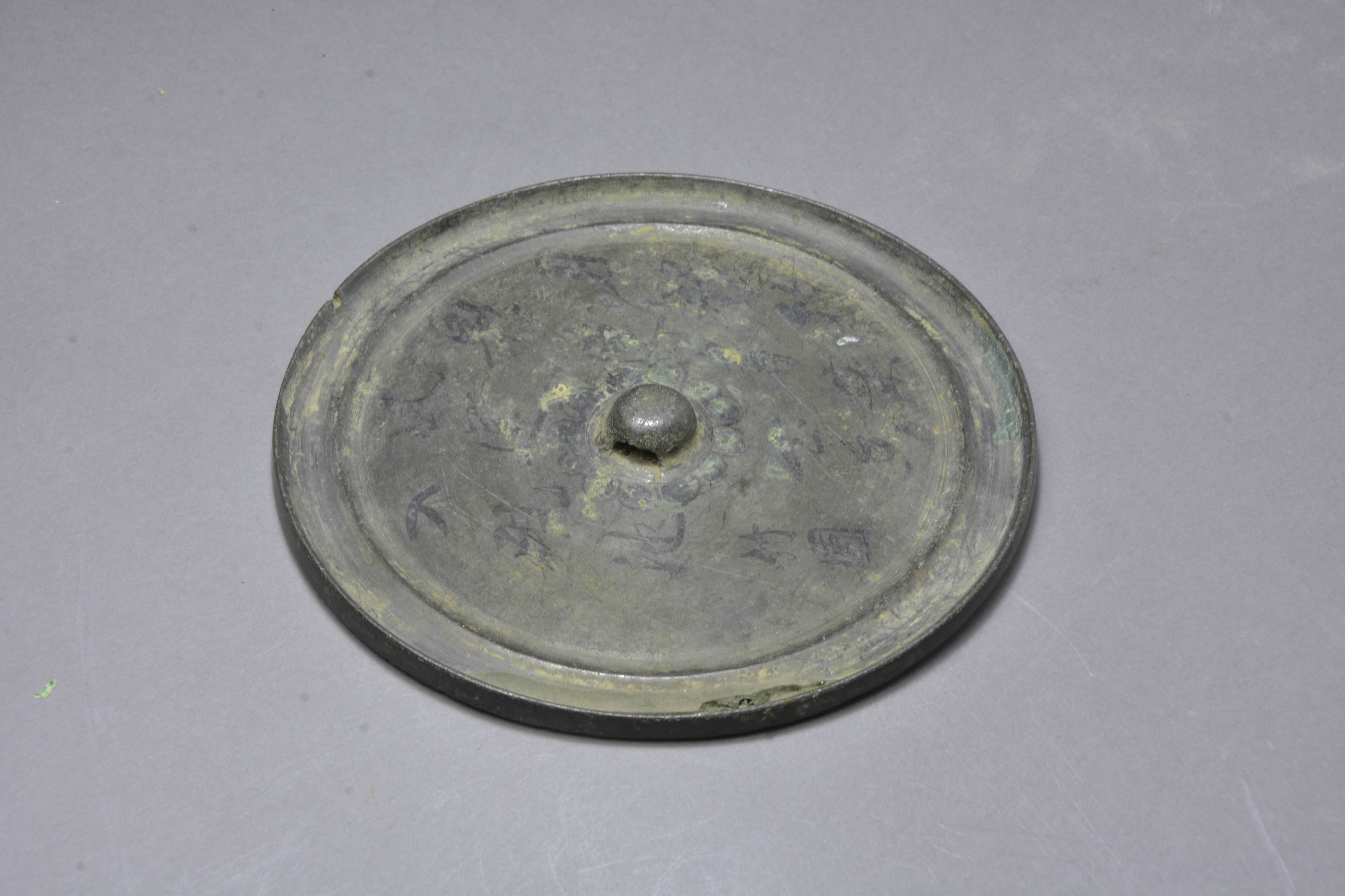 圆形,圆钮。近缘处饰一周凸弦纹。弦纹内后人墨迹“月移竹影连书案,风送花香入砚池。竹圃。”卷素缘。