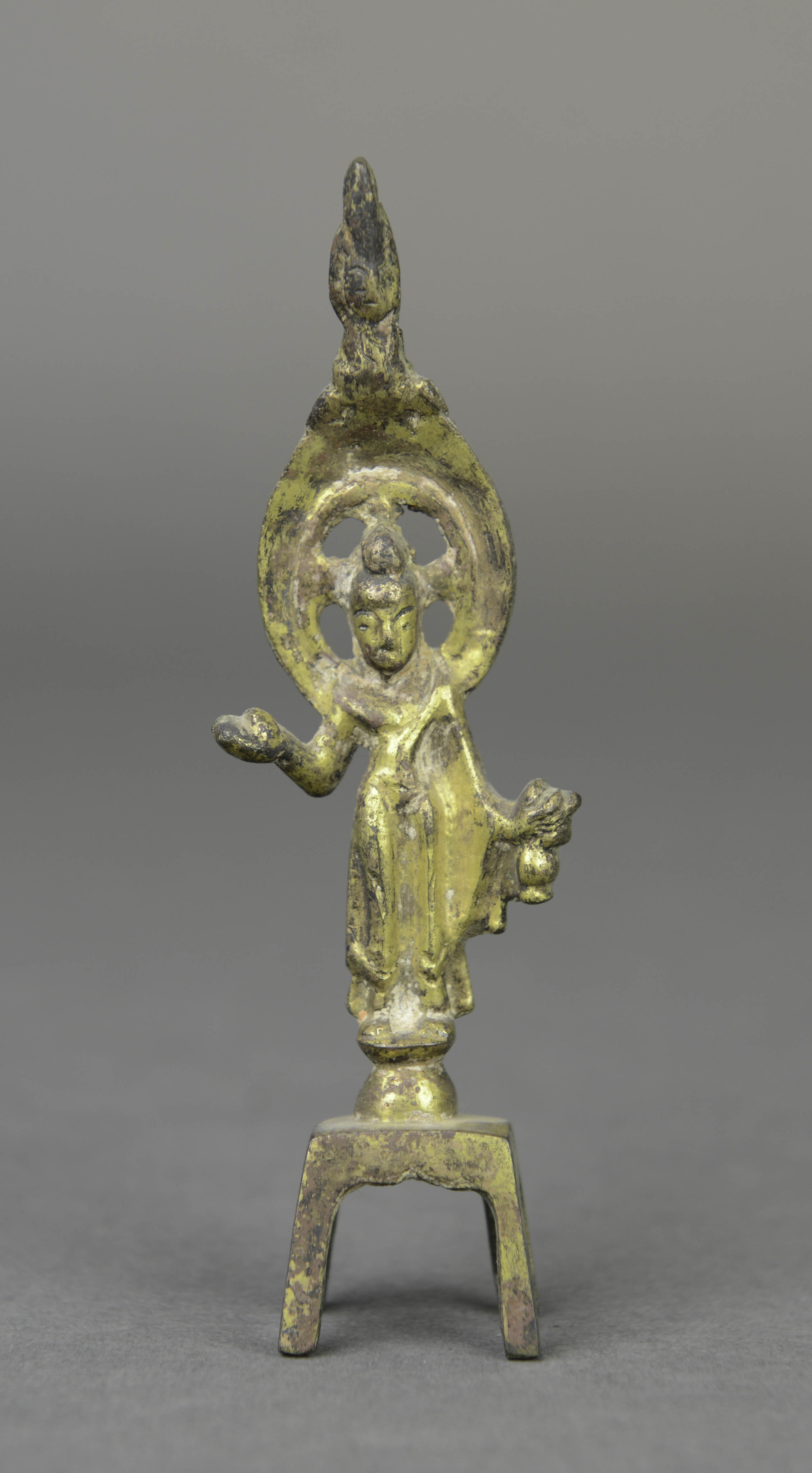 头戴宝冠,面相方圆,脑后有镂空桃尖形背光,背光顶端置一小坐佛。身着圆领通肩披帛,细腰束腹,右手曲至肩,左手下垂持一净瓶,跣足立于束腰座之上,下接四足方床。通体鎏金。
